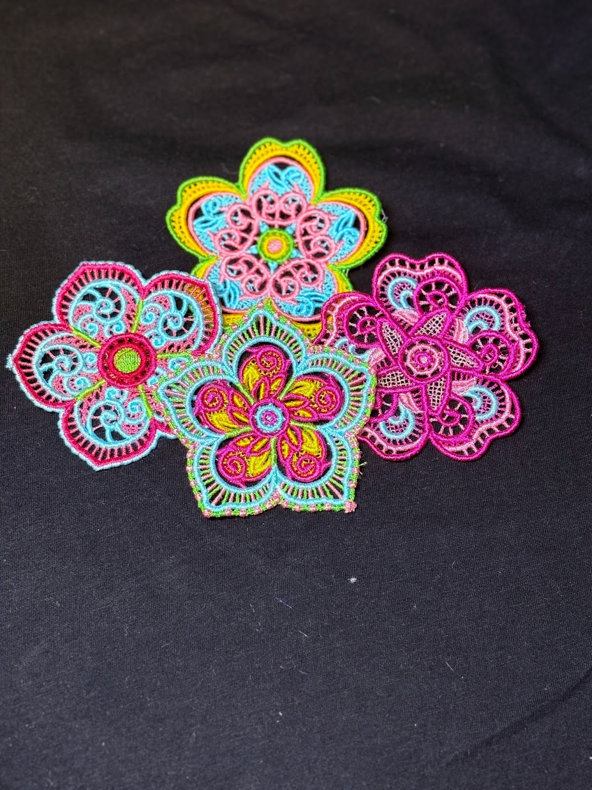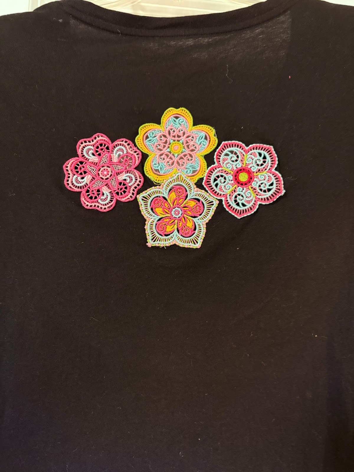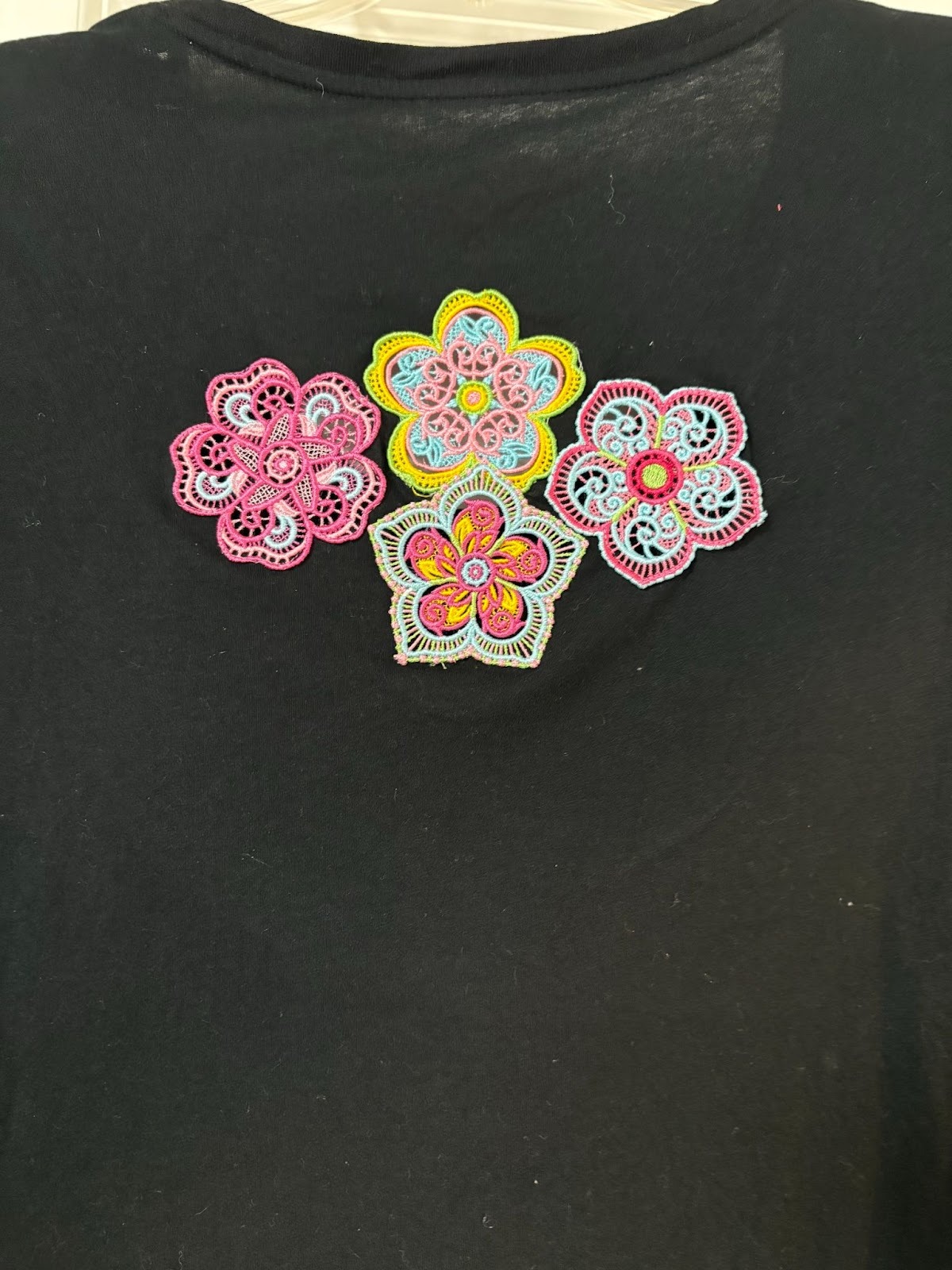 Do you have old T-shirts you don’t wear anymore because you’re tired of them? Let’s give them new life with lace designs. Stitch a variety of designs. I used Free Standing Lace Flowers 1. Arrange the lace designs on the back of the T-shirt.