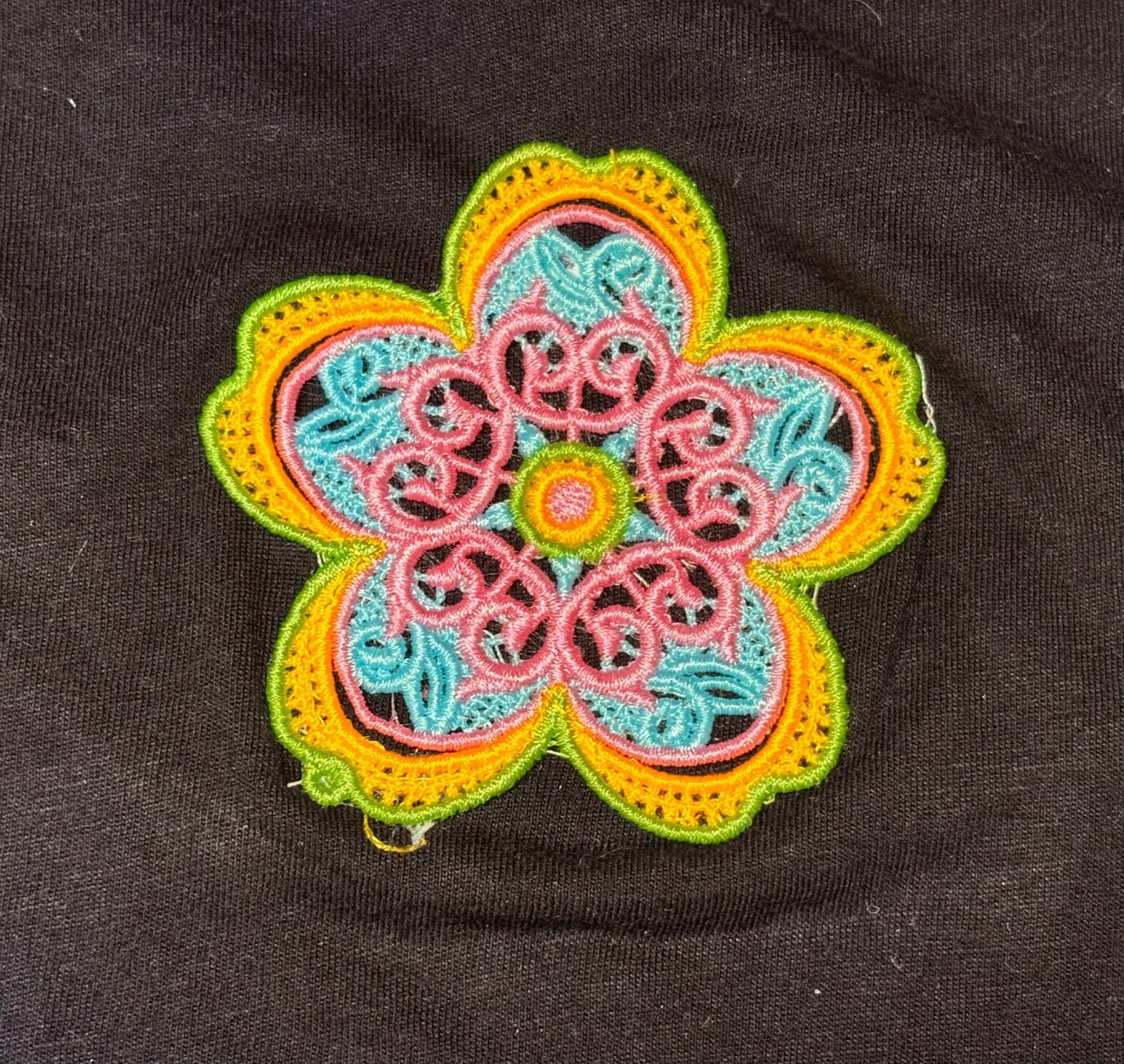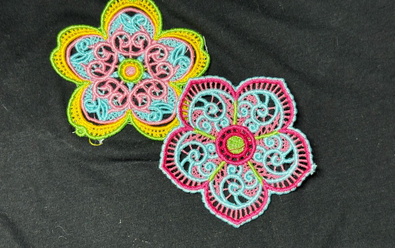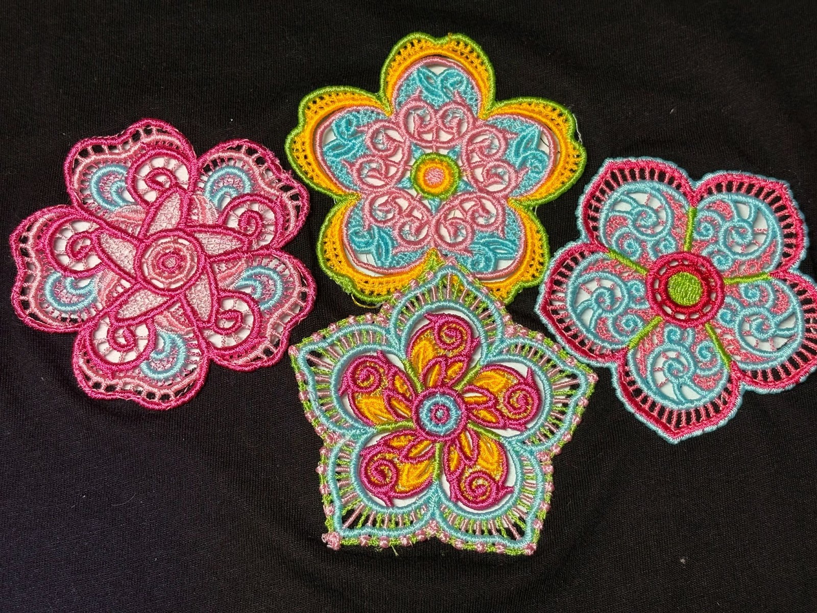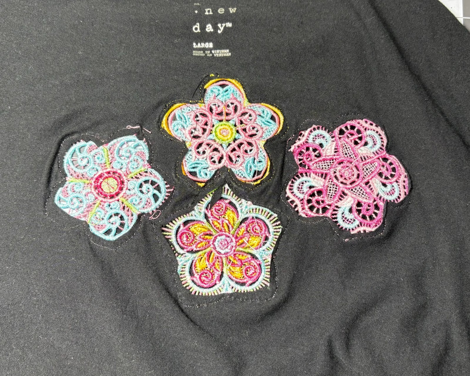 Do you have old T-shirts you don’t wear anymore because you’re tired of them? Let’s give them new life with lace designs. Stitch a variety of designs. I used Free Standing Lace Flowers 1. Arrange the lace designs on the back of the T-shirt.