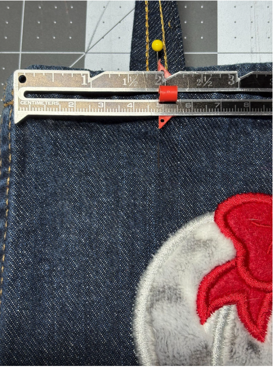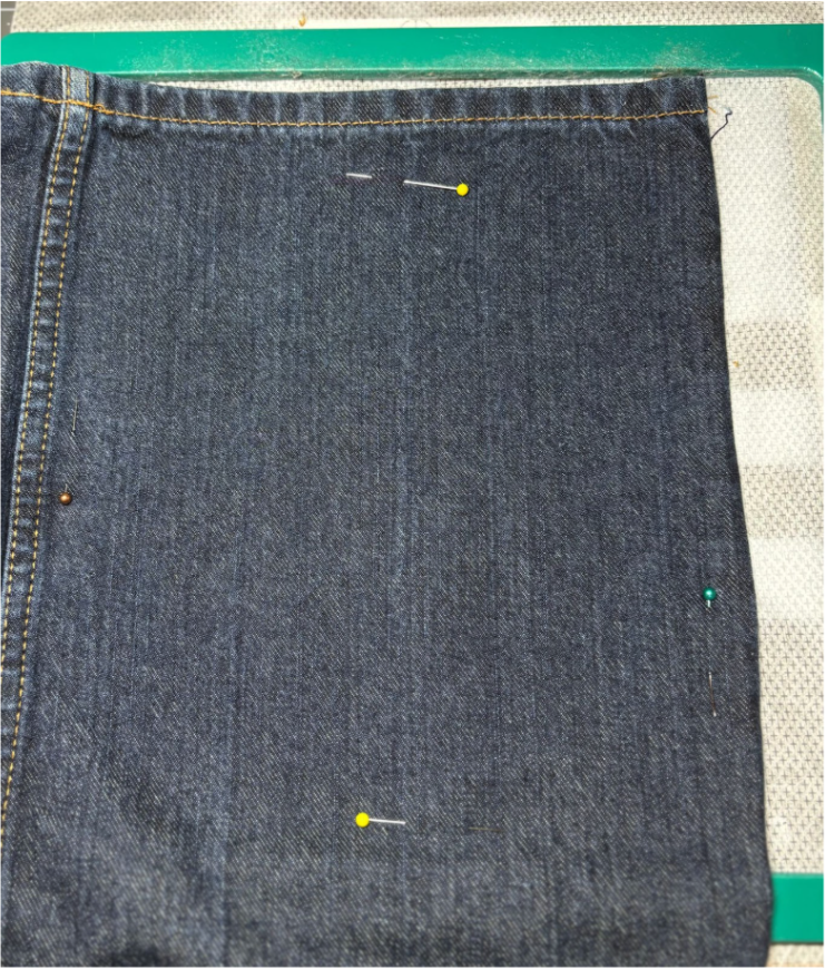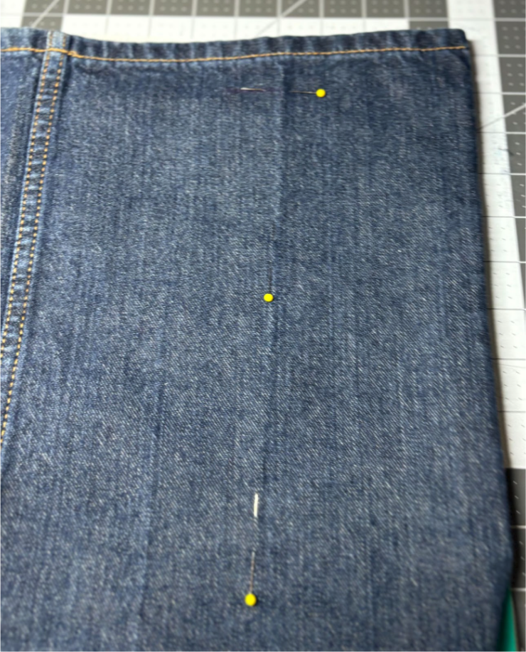 Align the top pin mark on the jeans with the top mark on the stabilizer. Use the other pins to ensure your fabric is straight.