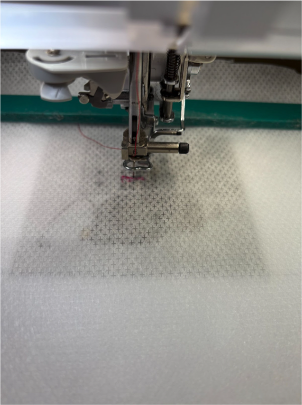 Trim excess fabric as you go. Keep the topper on until the embroidery is fully finished.