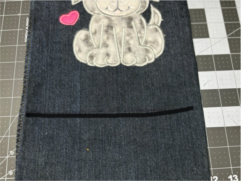 If you’re happy with the placement, remove the template. Fold the pant leg in half to find the center of the bag front.