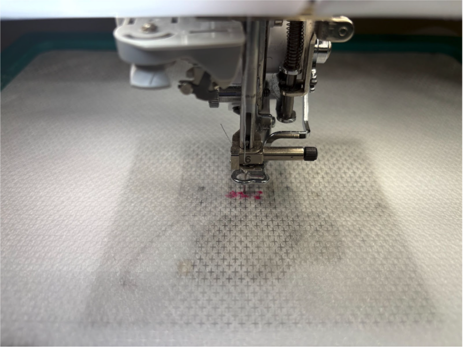 Load the design to your machine. Hoop wash-away stabilizer, take to your machine, and find the center of your design. Mark the stabilizer and remove the hoop to sit on a flat surface.