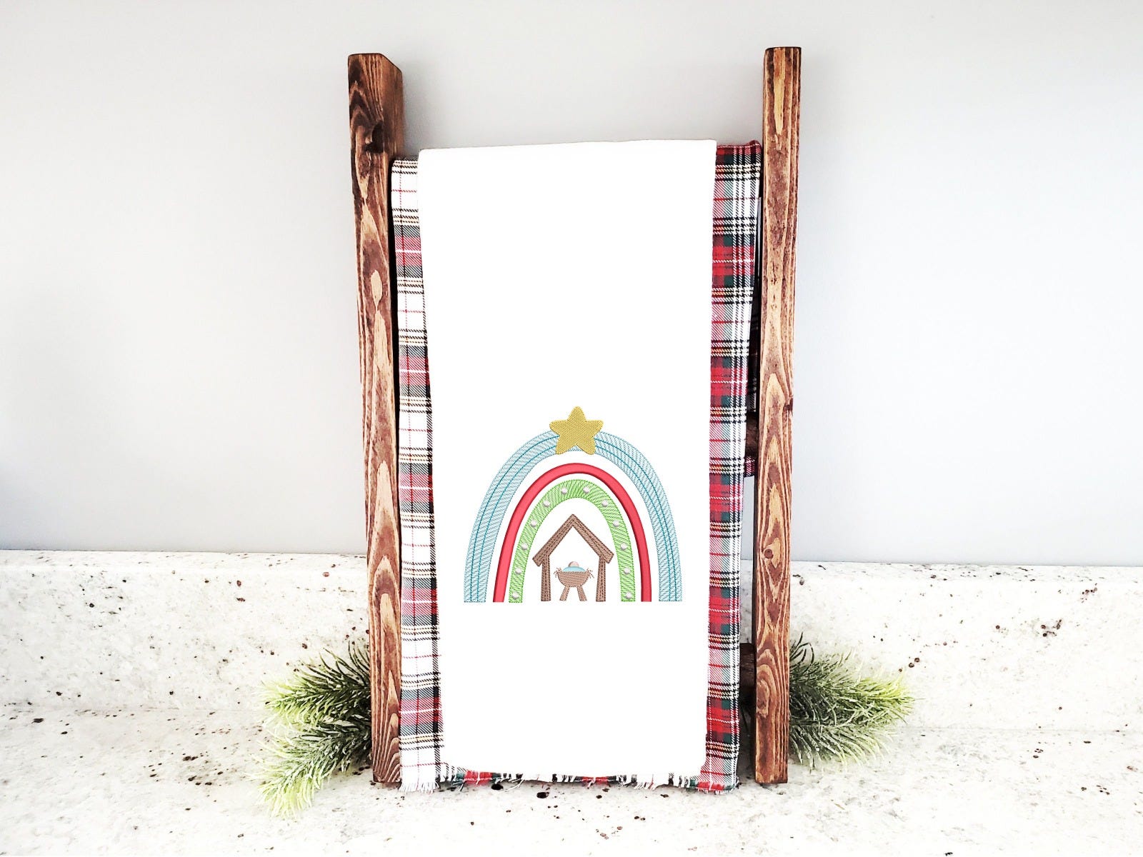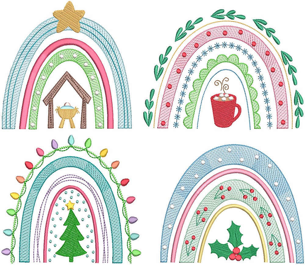 4 adorable, modern and fun Christmas rainbows! These embroidery-only designs feature a blend of sketch, satin, bean, motif and fill stitches.