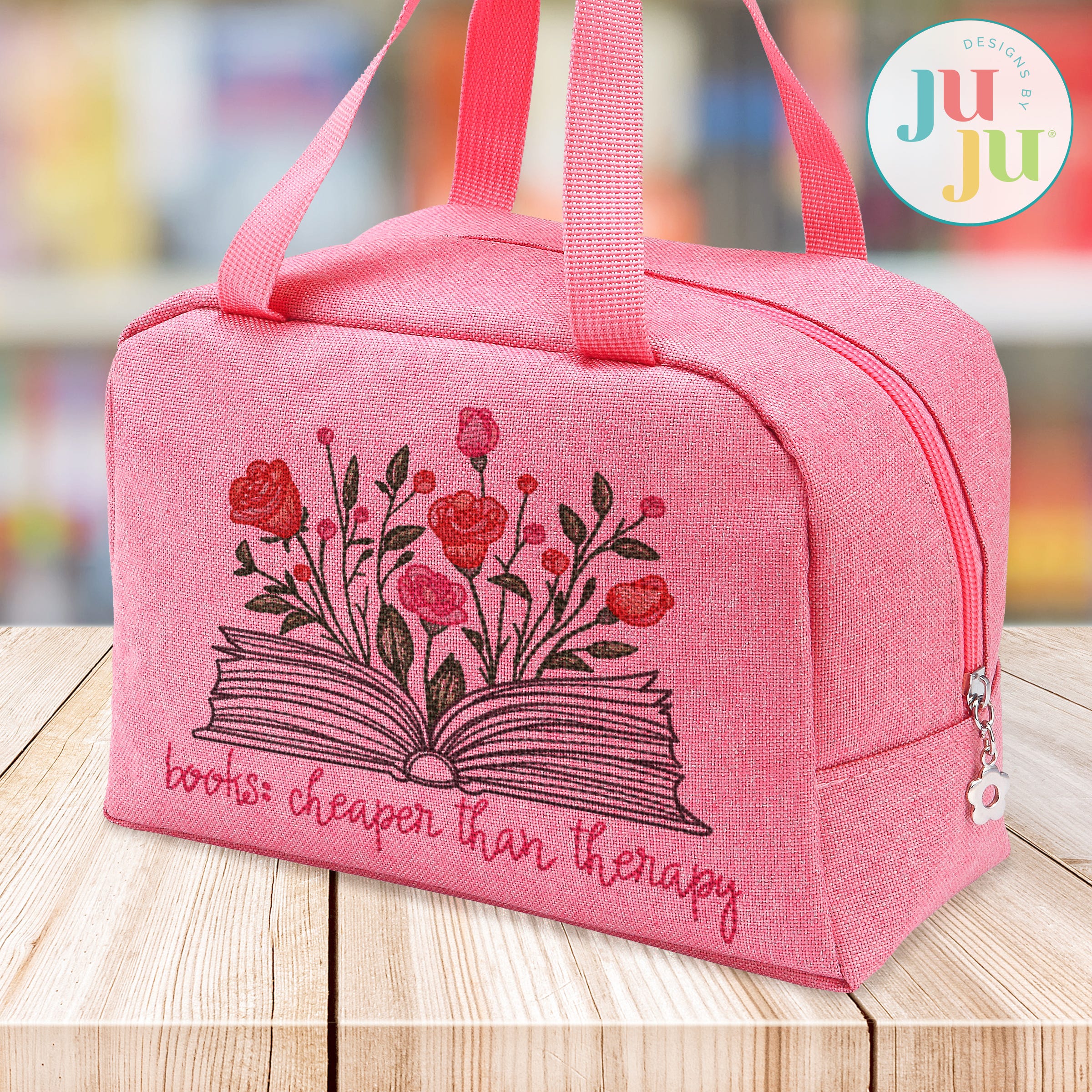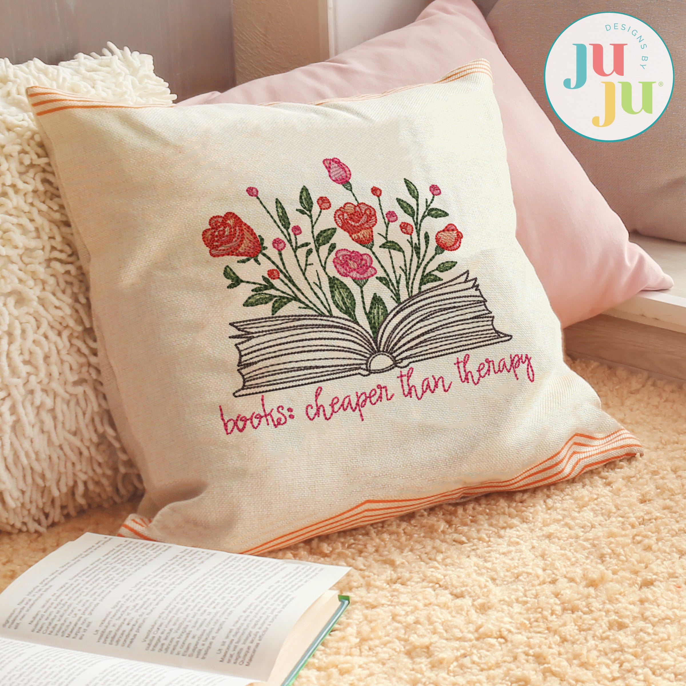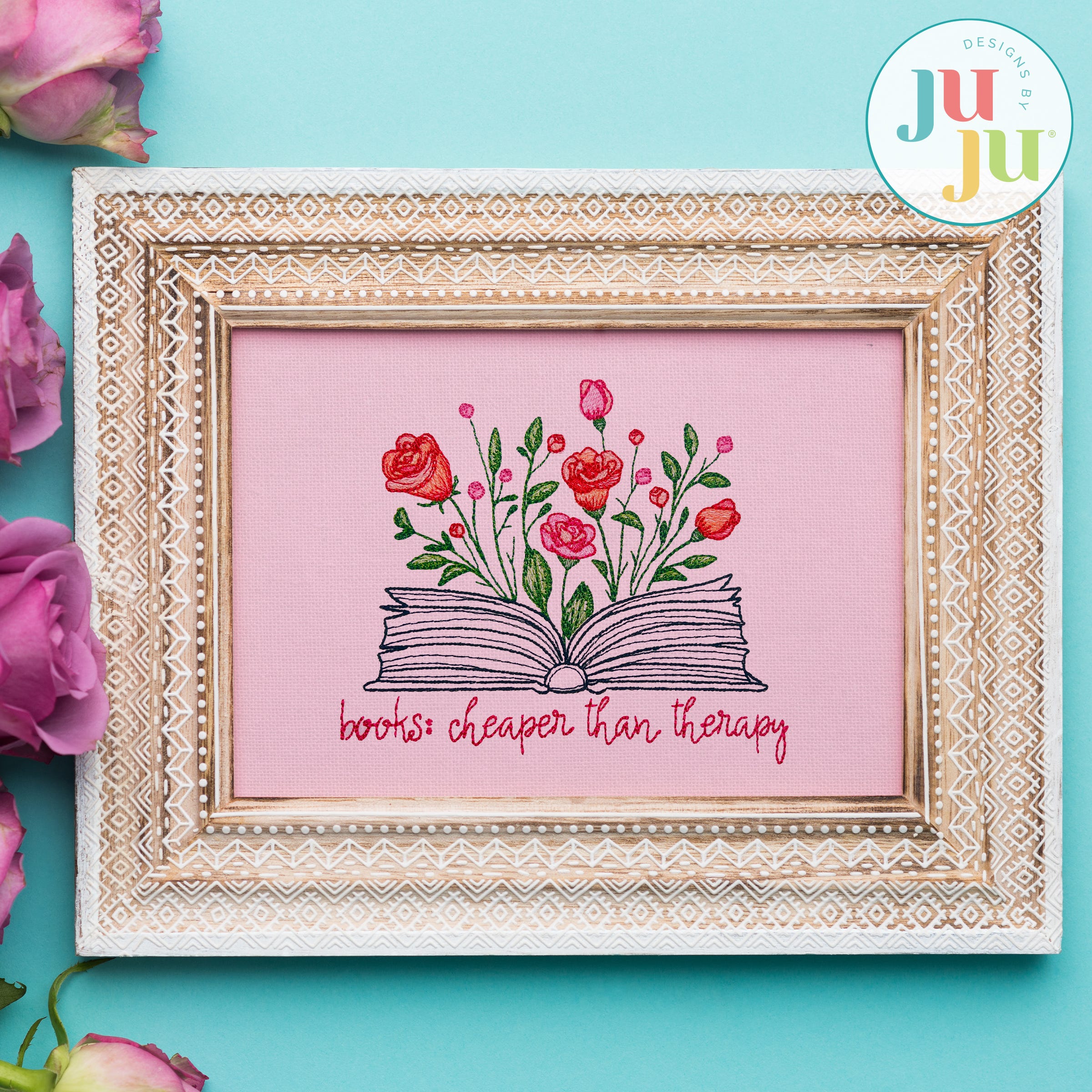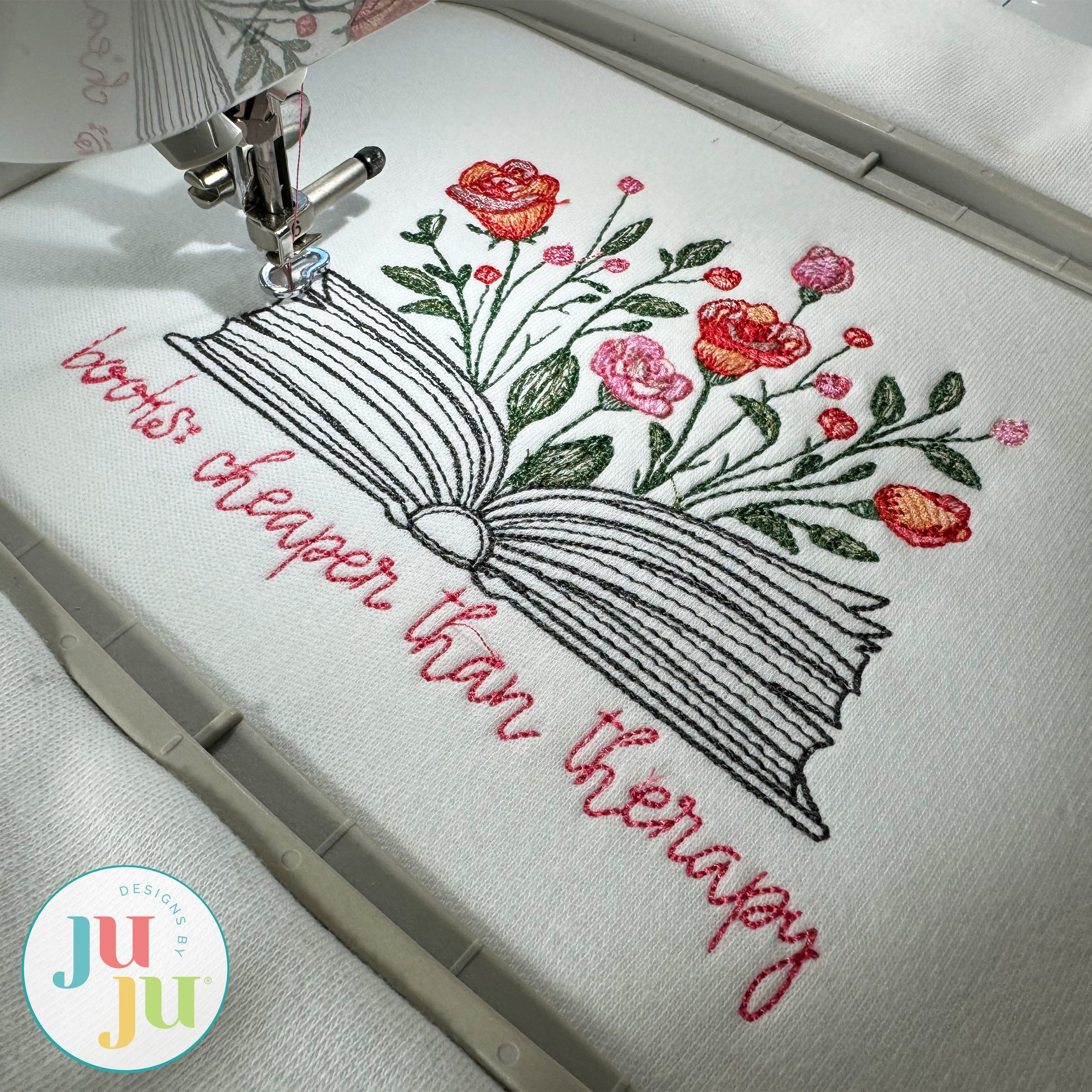 Books: cheaper than therapy! This single embroidery-only design features sketch fill flowers blooming out of a bean stitch book. The bean stitch lettering is included in the design file, as pictured.
