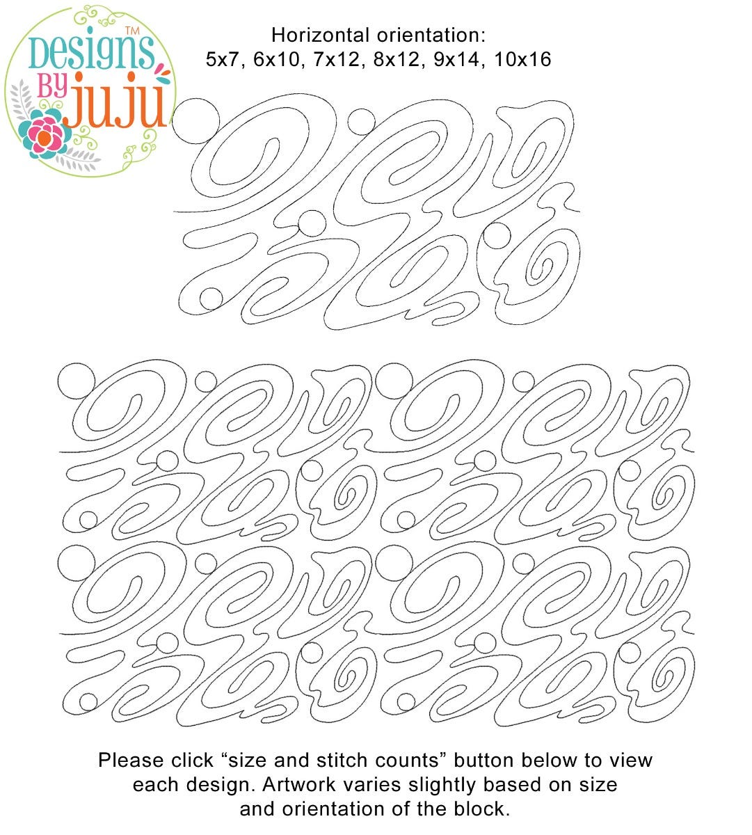 Each one of our End-to-End Quilting™ embroidery designs is an originally created design available in a large variety of block sizes. Every block is one continuous single-run line running edge to edge beginning on the left and exiting on the right. There is NO backtracking or double stitching. Each size block has been engineered and manually digitized by our team for EXACT edge-to-edge quilting precision so that when they are aligned properly in your hoop, you cannot tell where one block ends and the next one begins! ADDITIONALLY, the art has been created for each size so that when the rows are stacked on top of each other, it provides a practically seamless, professional, allover quilting effect that mimics (E2E) pantographs so you can do edge-to-edge quilting on your embroidery machine!