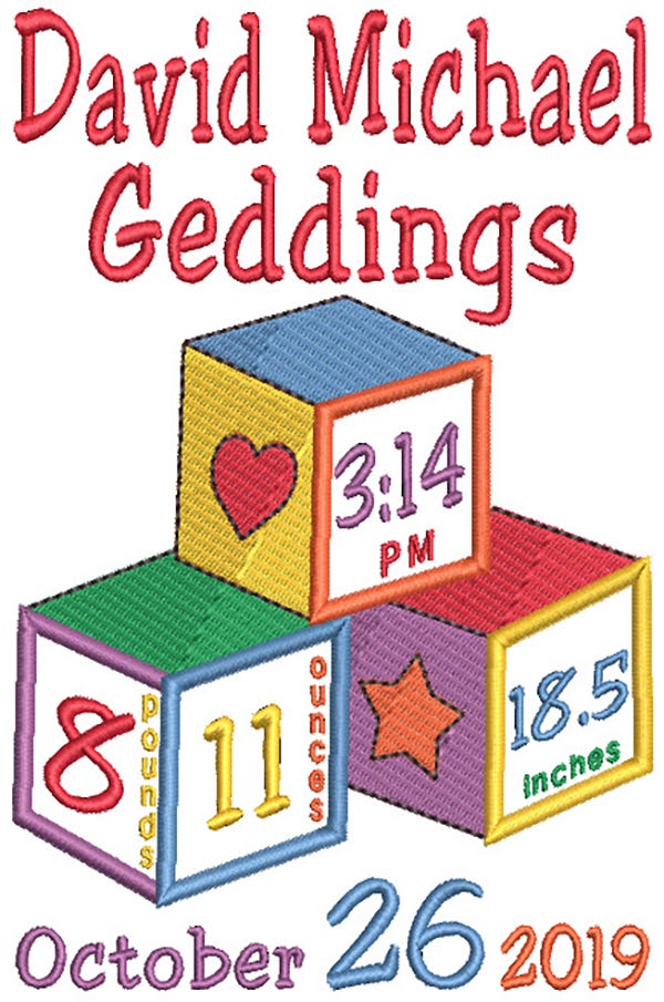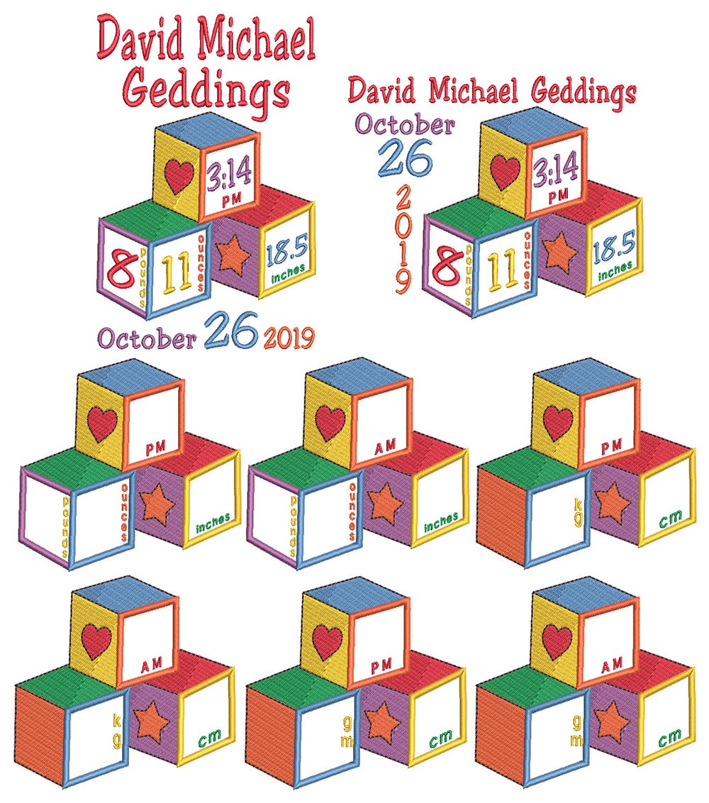 You will receive the embroidery templates shown. Customize with your own names, date, weight and length with fonts from your purchased collection or those that are built in to your embroidery software. Fonts are NOT included with these templates. I have included a "basting" stitch as the first step so that while you are customizing in your software, you can ensure to stay with the parameters of your hoop. Skip the first step upon stitching.