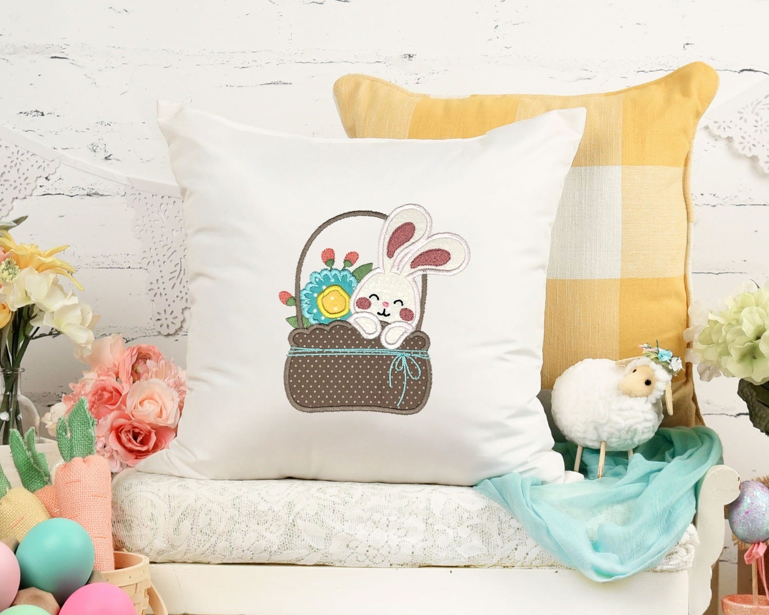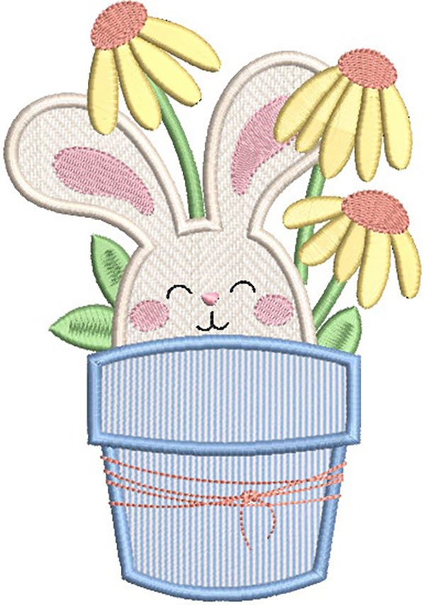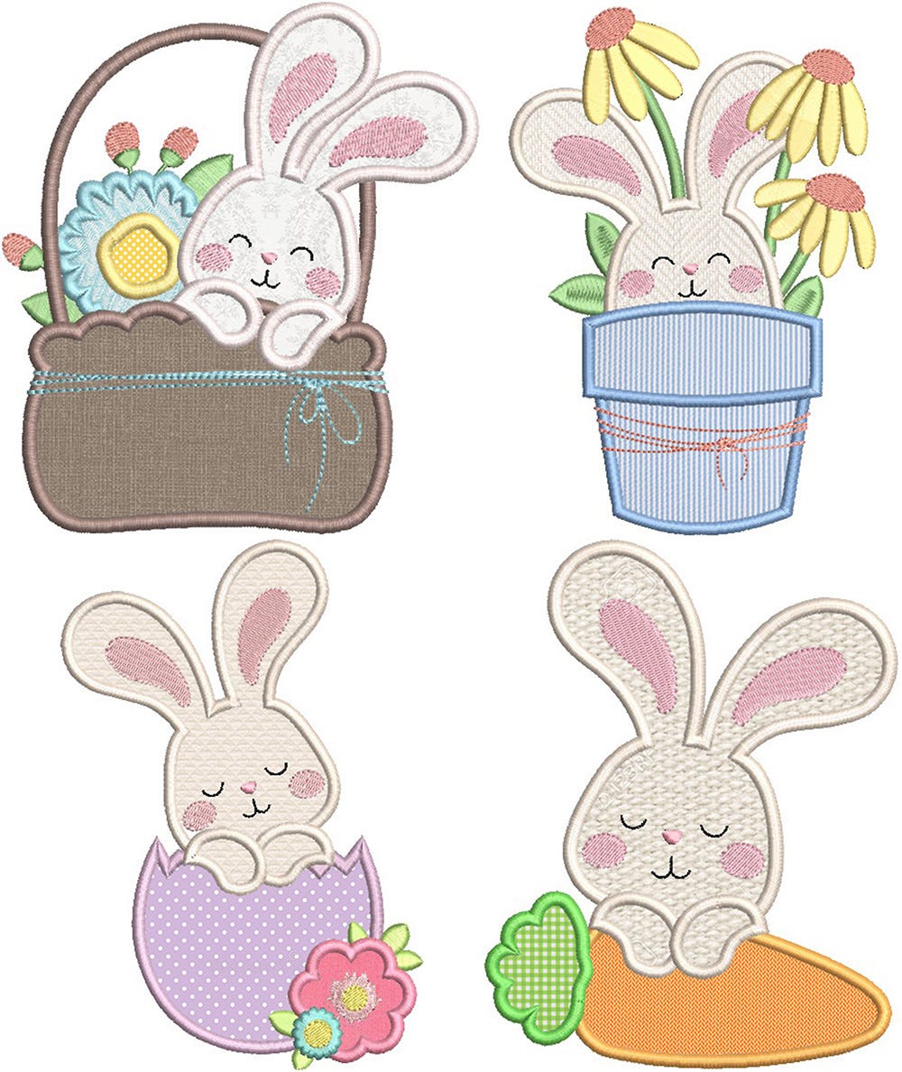 Four sweet, loving bunny applique designs for you to use on projects for spring! The set includes a bunny in a basket, a bunny in a pot of flowers, a bunny in an Easter egg, and a bunny holding a carrot. Perfect for Easter and beyond!