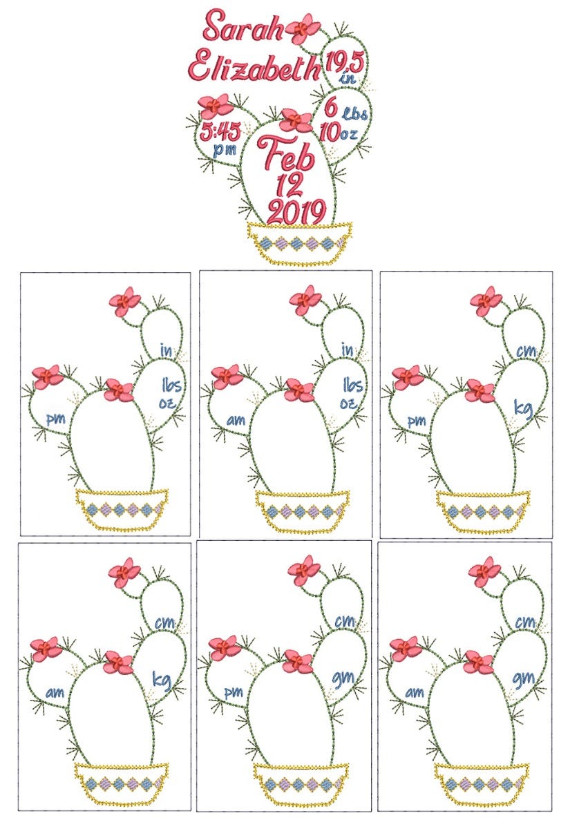 You will receive the embroidery templates shown. Customize with your own names, date, weight and length with fonts from your purchased collection or those that are built in to your embroidery software.Ā I have included a "basting" stitch as the first step so that while you are customizing in your software, you can ensure to stay with the parameters of your hoop. Skip the first step upon stitching.