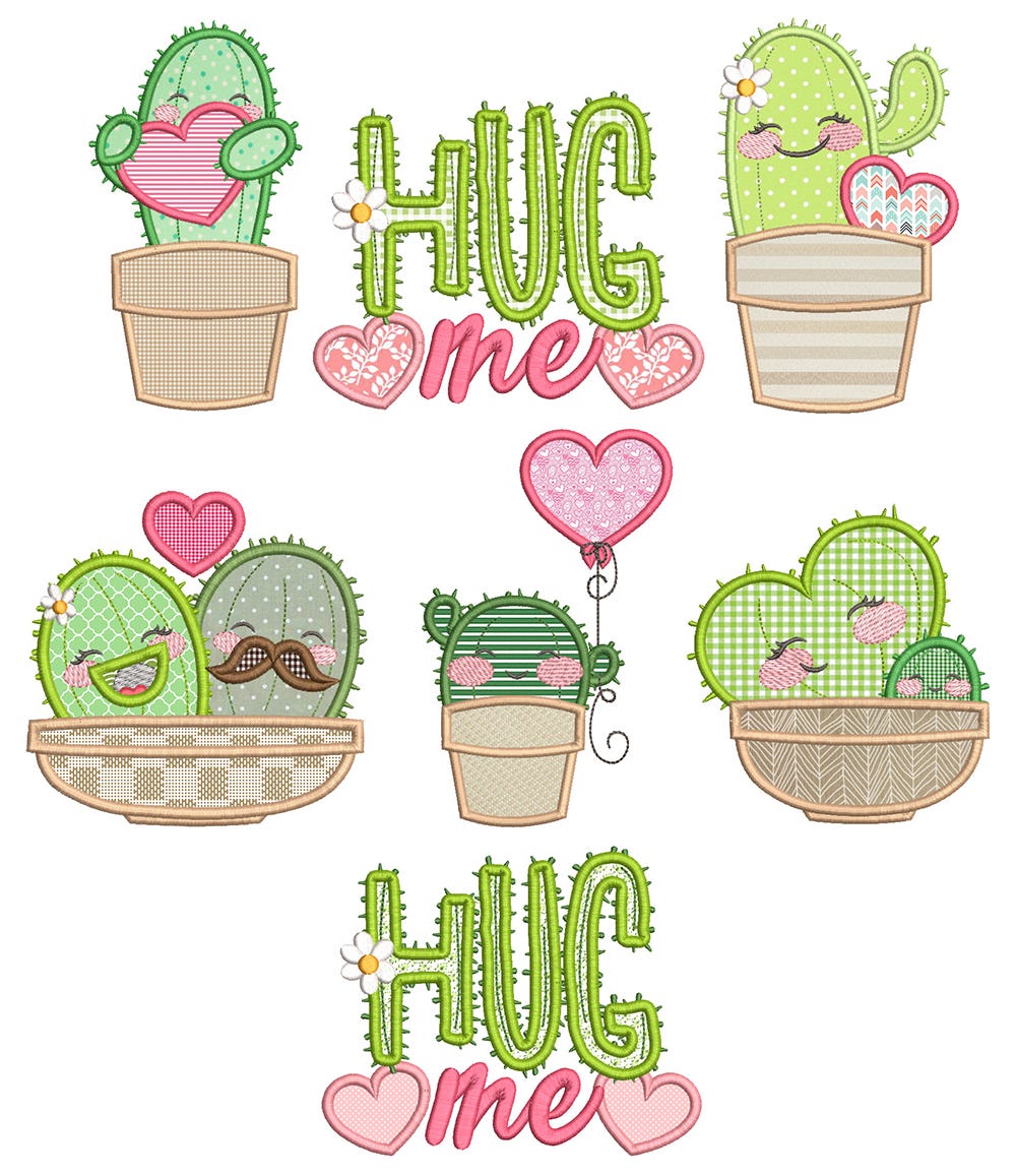 7 perfectly prickly, Valentine's Day inspired cactus designs in applique! *please note alternate "HugMe" design features a motif fill.
