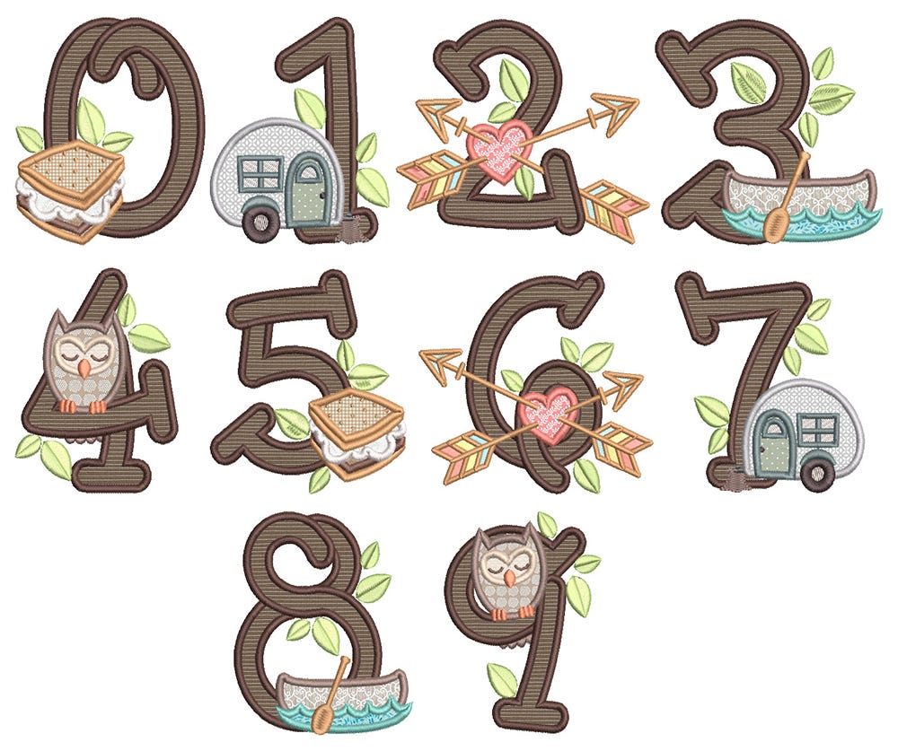 Numbers 0-9 with an cute camping theme in applique!