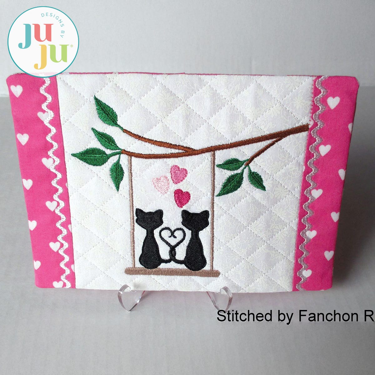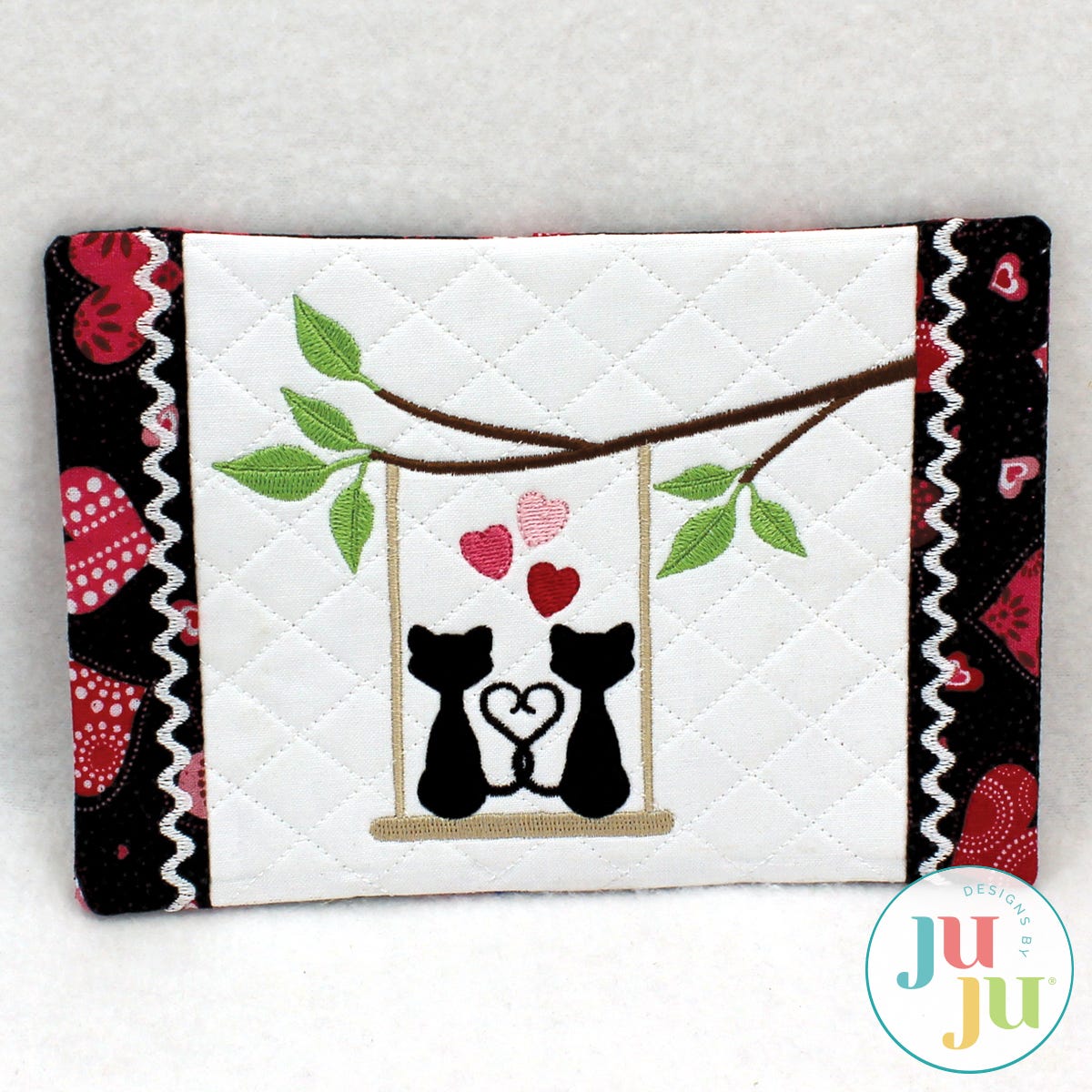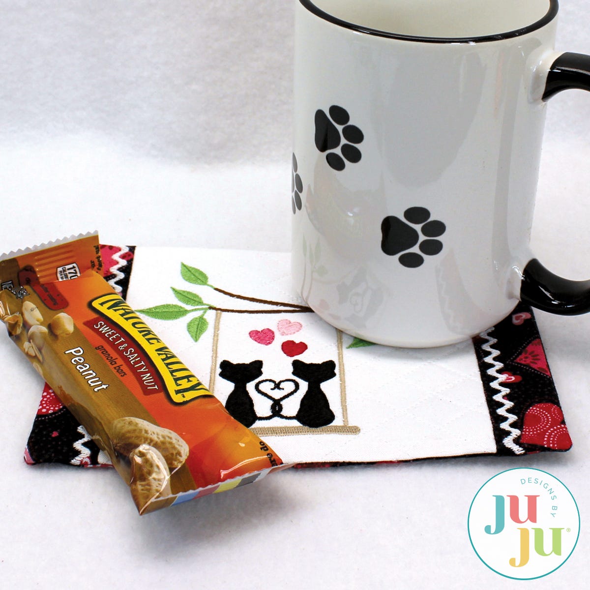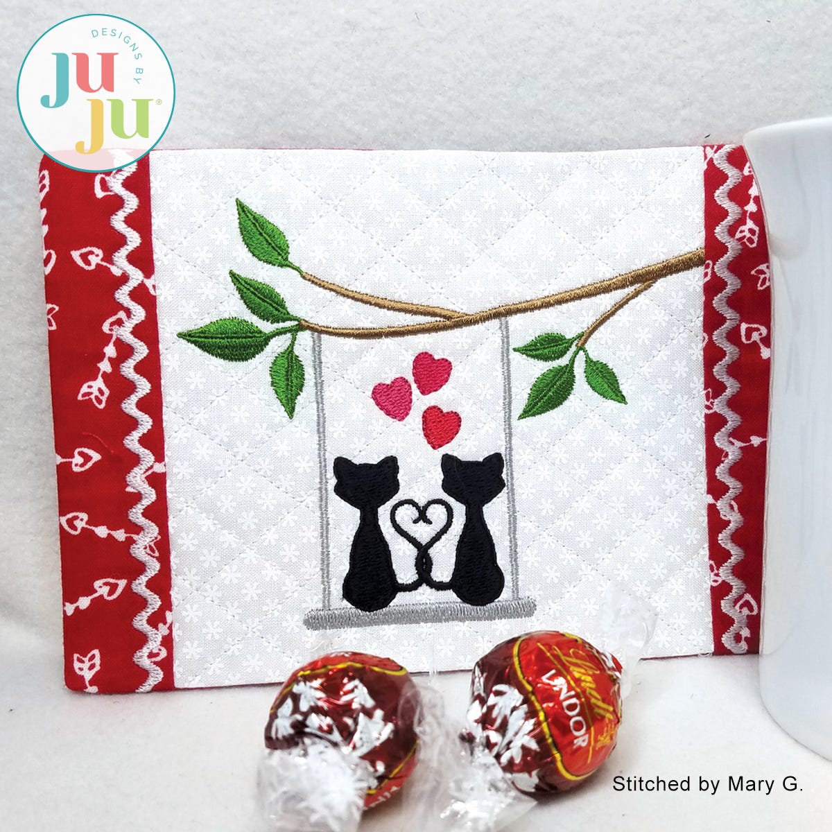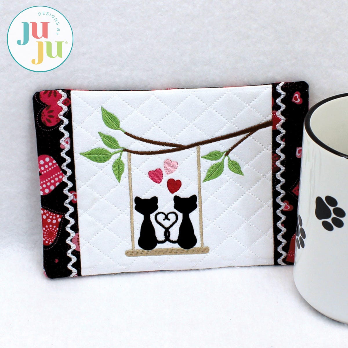 The mug rug also comes with a printable, coordinating tag (in pdf format). The tag explains what a mug rug is and how to wash it. You are receiving two stitch files: One with the cat motif; another one without for you to insert a design of your own choosing. This Valentine's day why not send a mug rug instead of a greeting card? It's a lot more useful.
