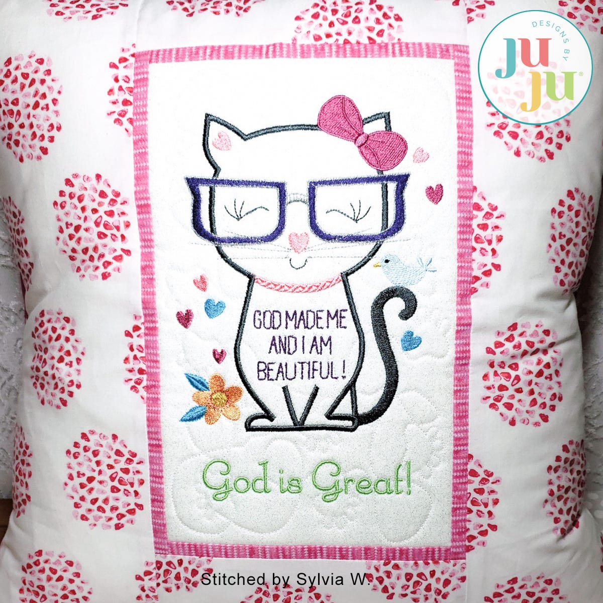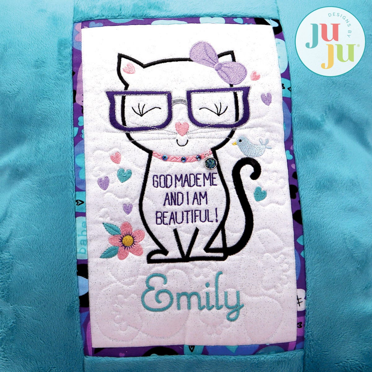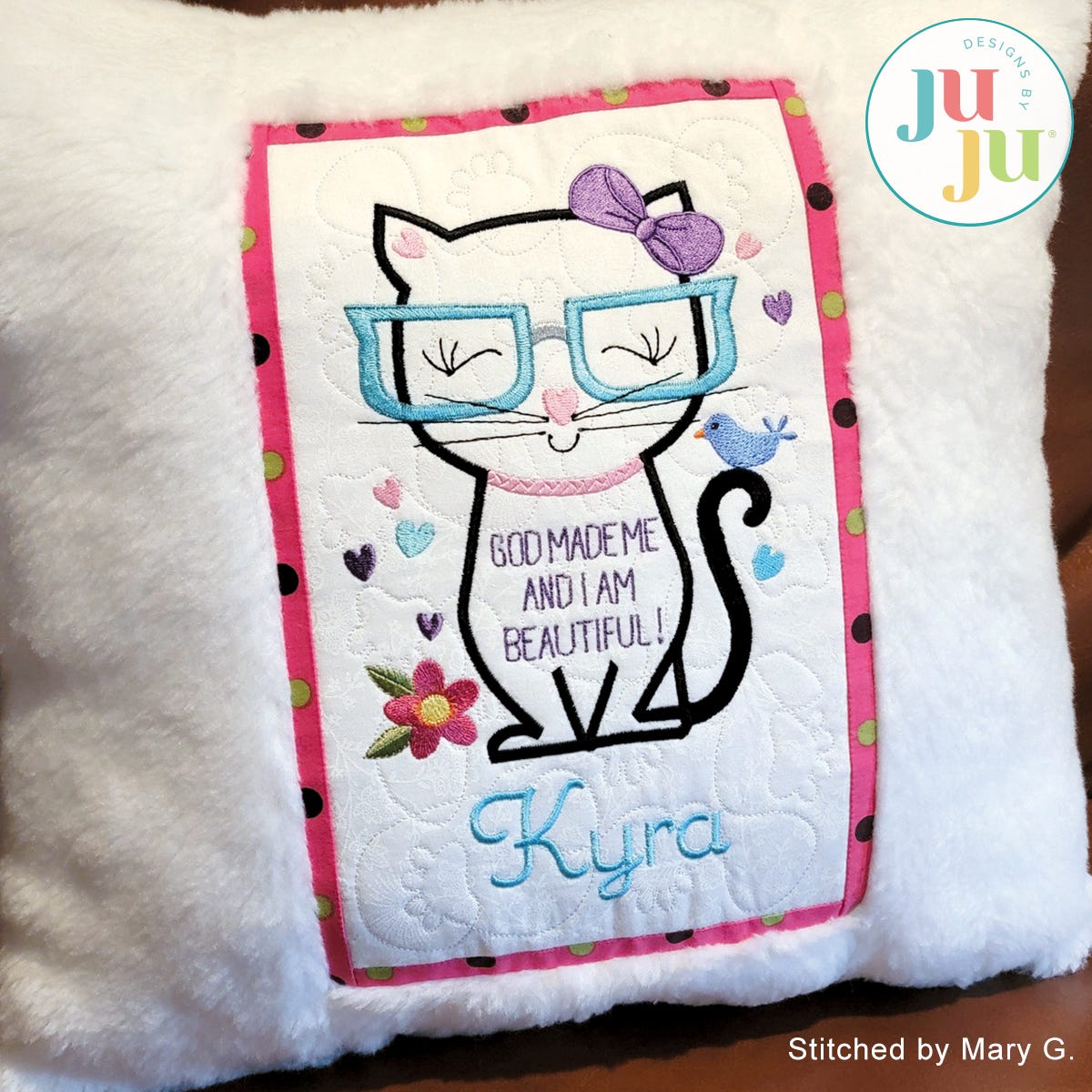 This fun pillow is made as a partial in the hoop project. The background is quilted in a paw motif and the contrast strips and borders are applied during the first hooping and finished on the sewing machine. The second, very quick hooping, applies the Velcro strips to the back. A small amount of machine stitching is required to stitch together the front and back of the pillow. Decorate with crystals for a little extra bling and fun. Can be made with Minkee or cotton fabrics. Detailed instructions with many photos are included with your purchase. Hints for stitching with Minkee are also included.