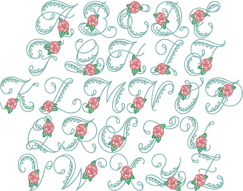 Our Catherine Sophia Alphabet features satin stitch lettering with beautiful roses that are a blend of sketch fill and satin stitch details. The light and airy "sketch" fill pattern allows for a quick stitch out. We do NOT recommend resizing designs with sketch elements in software.