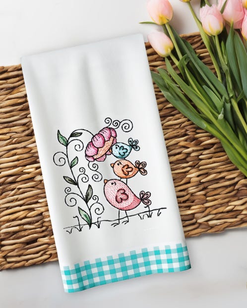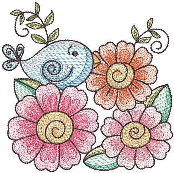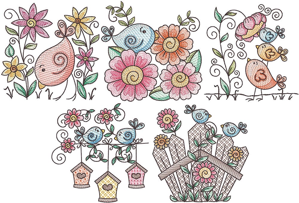 Five sweet spring bird designs featuring a blend of sketch and motif fills with bean stitch outlines in four sizes.