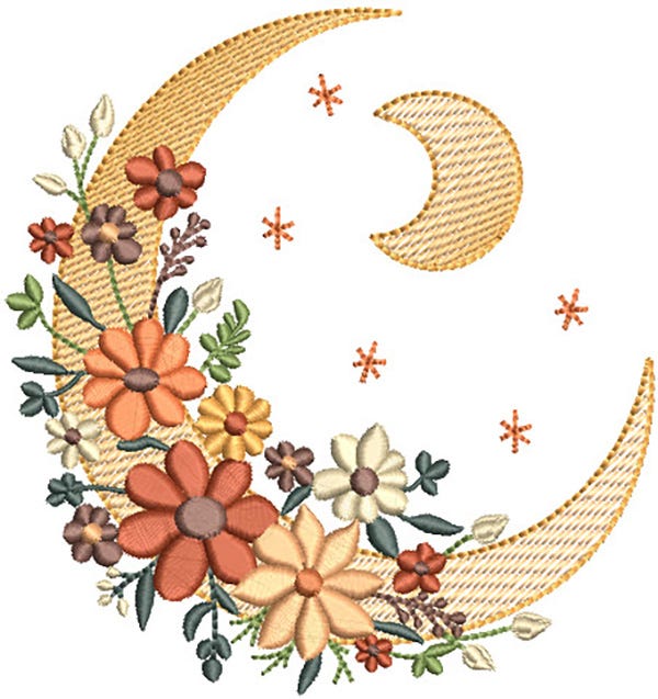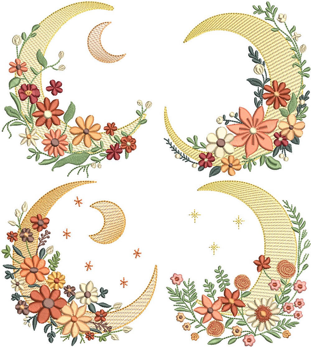 4 more gorgeous celestial floral designs! The sketch fill moons are adorned with satin and fill stitch flowers.