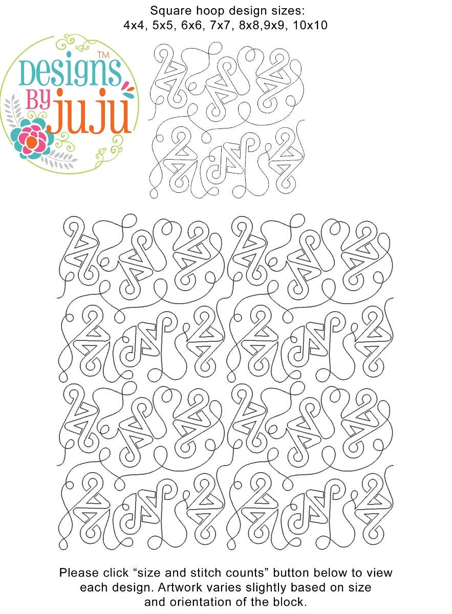 Each one of our End-to-End Quilting™ embroidery designs is an originally created design available in a large variety of block sizes. Every block is one continuous single-run line running edge to edge beginning on the left and exiting on the right. There is NO backtracking or double stitching. Each size block has been engineered and manually digitized by our team for EXACT edge-to-edge quilting precision so that when they are aligned properly in your hoop, you cannot tell where one block ends and the next one begins! ADDITIONALLY, the art has been created for each size so that when the rows are stacked on top of each other, it provides a practically seamless, professional, allover quilting effect that mimics (E2E) pantographs so you can do edge-to-edge quilting on your embroidery machine!