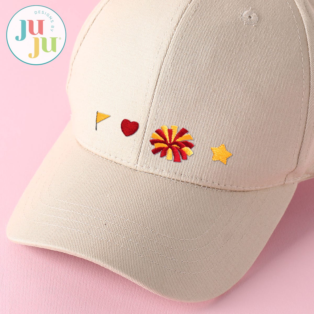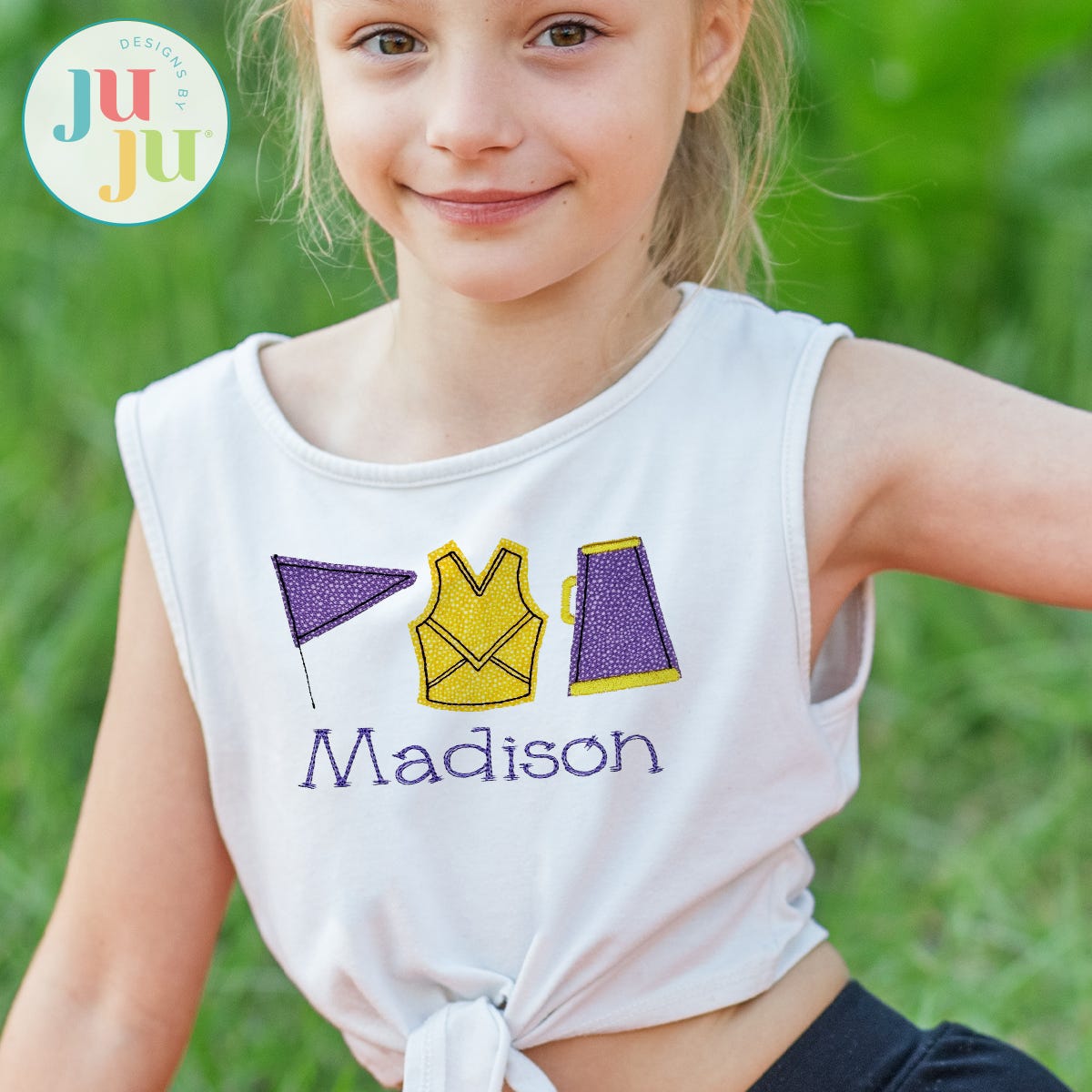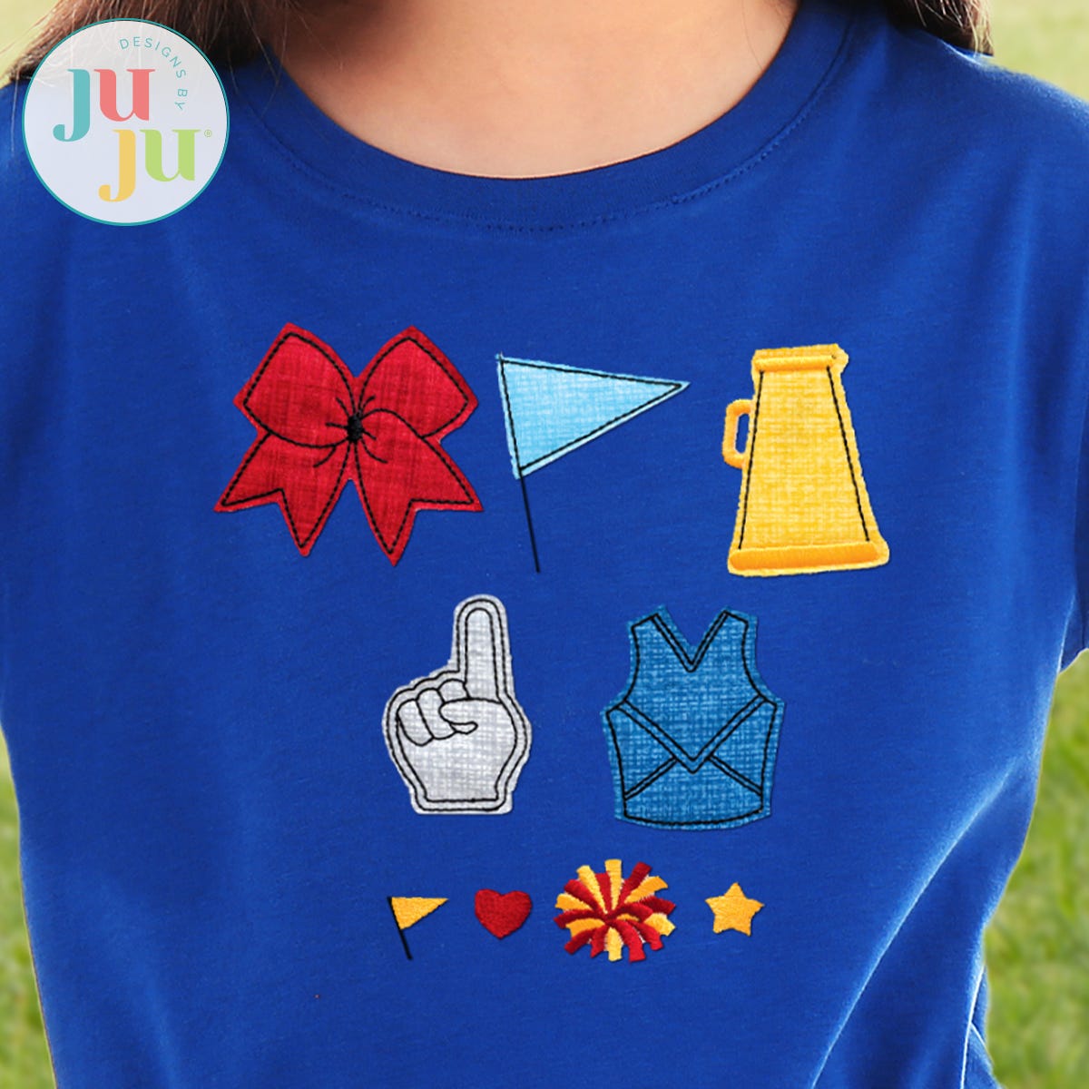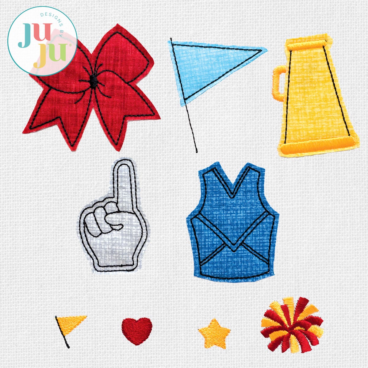 The Cheer Kit includes 5 appliques (bow, flag, megaphone, number 1 hand, and uniform top) and 4 embroidery-only accents (flag, heart, pom-pom, and star).
