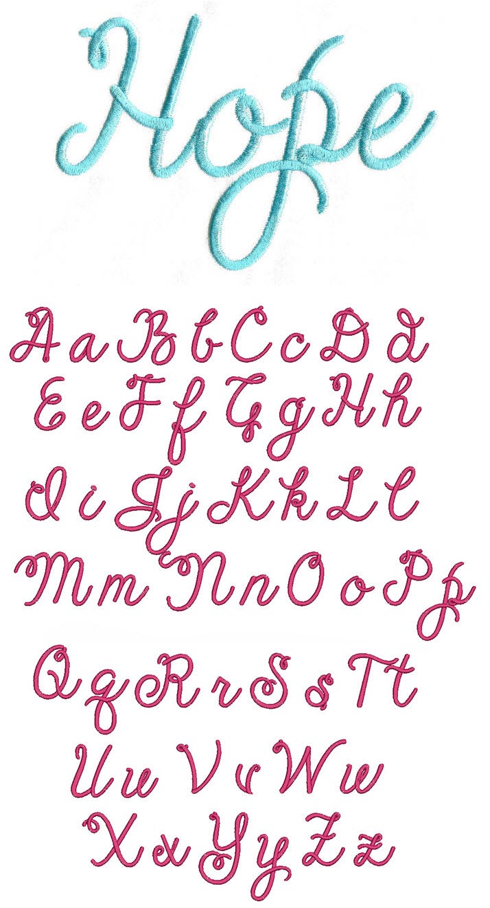 Another fun and beautiful script font from Kimberly Geswein! All of our font alphabets are 100% manually digitized to bring you maximum stitch quality.