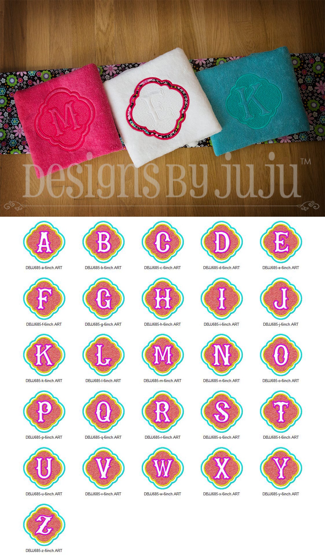 A Designs by JuJu Exclusive! A chic and classy embossed monogram...this will be perfect for your upcoming holiday gifts! You can stitch this monogram in three different ways. 1) Use the included applique placement and tackdown lines to make your frame applique 2) skip the applique and stitch a classy double border tone on tone (or use some color) design 3) Omit the outer border and just stitch as a single border. Any way you choose, you are sure to LOVE this new monogram!