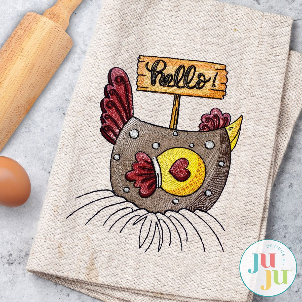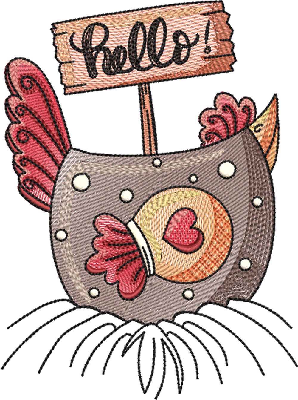 A country chicken greeting you with a friendly Hello! This single design features multiple color layers of lighter density fill to create a blended, variegated, textured look. The text is included in the design as pictured. Four sizes included (4x4, 5x7, 6x10 and 8x8).