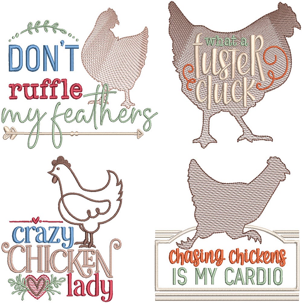 4 more adorable word art designs for chicken lovers! These designs are embroidery-only with satin stitch text and sketch fill chicken silhouettes and heart. The light and airy "sketch" fill pattern allows for a quick stitch out. We do NOT recommend resizing designs with sketch elements in software.