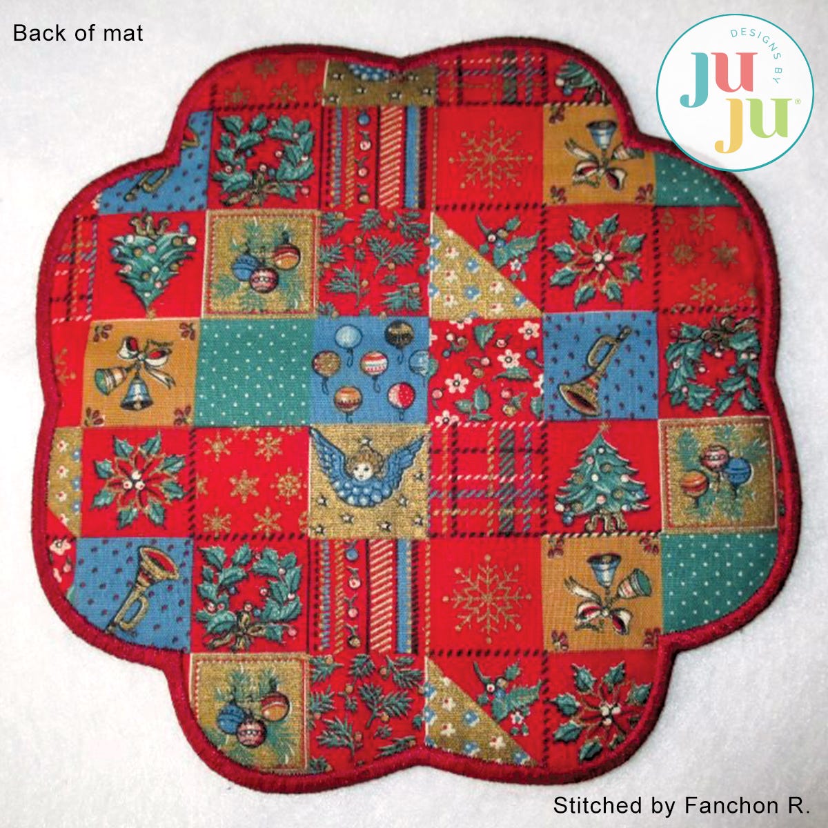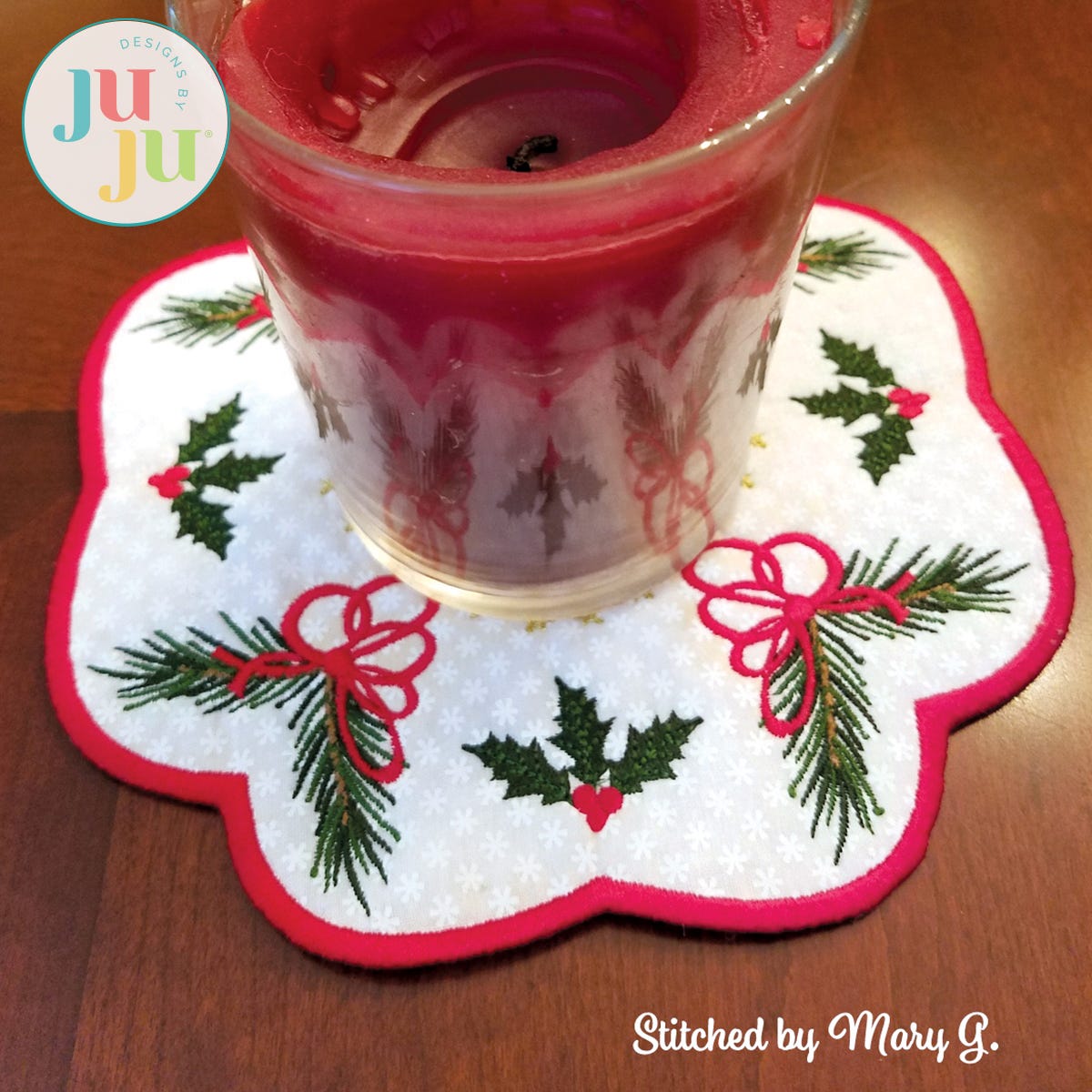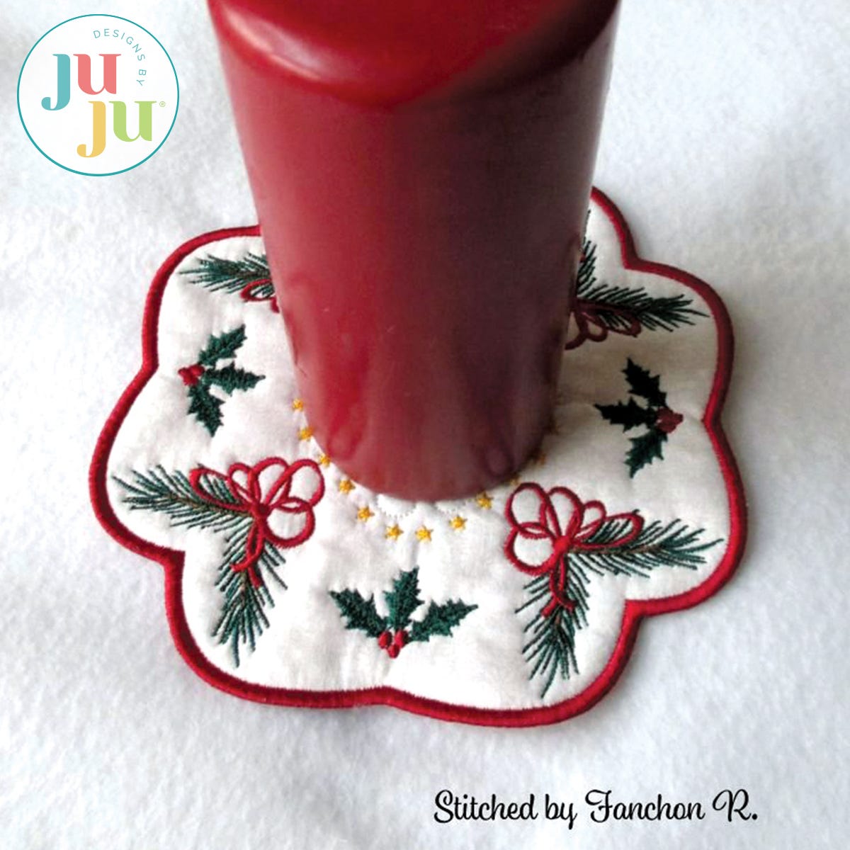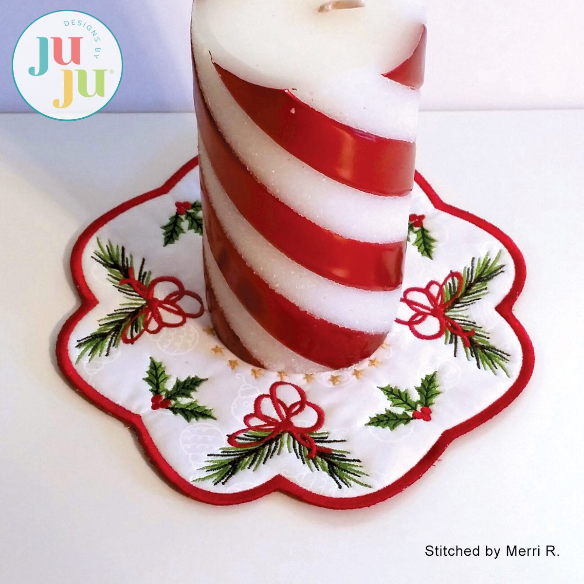 This festive candle mat requires a hoop that accommodates a true 7.00x7.00" design. The center is stipple quilted, the pine and holly embroidery coordinates with our Christmas table runner.