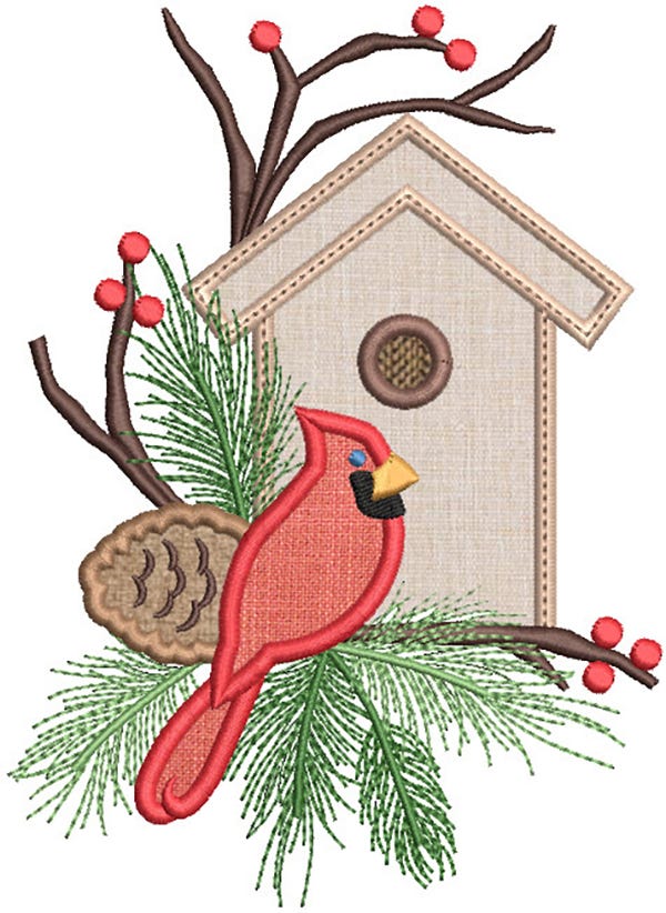 This Cardinal and birdhouse applique design is perfect for Christmas projects.