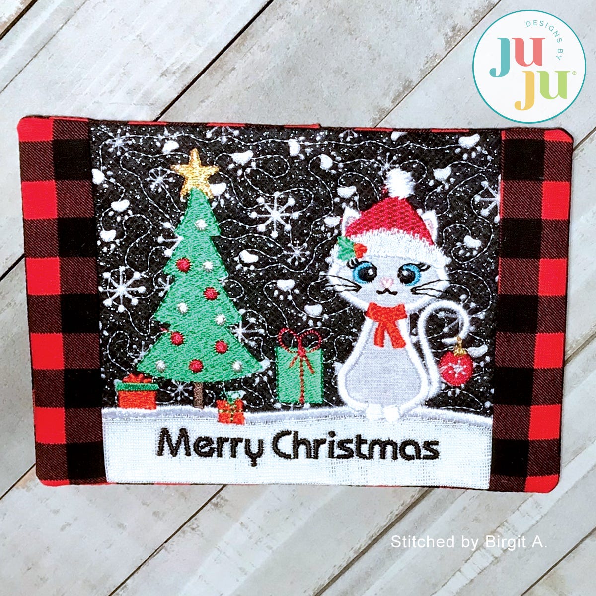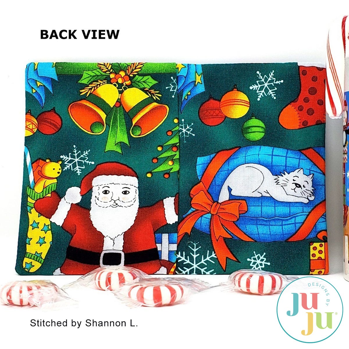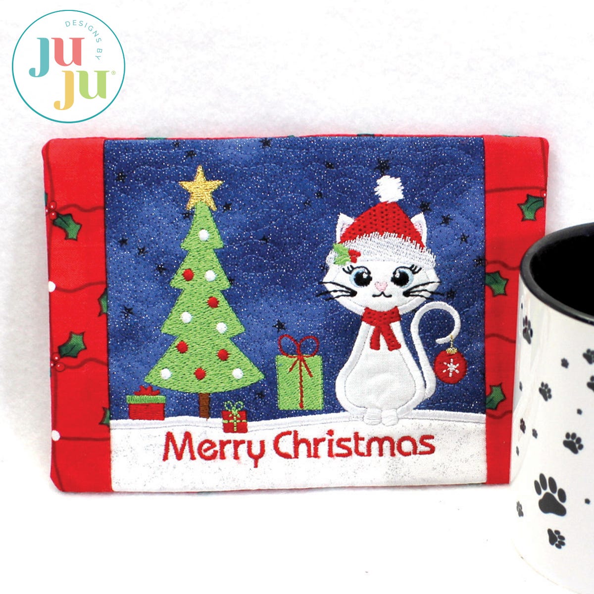 This mug rug is a great little gift for the cat lover in your life. And don't forget to make one for yourself, too! Send this mug rug as a Christmas card in an A7 envelope. Mug rugs are not just for a cup of cocoa, tea or coffee; they can also be displayed on a small easel to add a whimsical touch to your holiday decorating. The design is completely stitched as an in the hoop project. There is no other sewing machine or hand stitching required. The body of the cat is appliqued. It is easy to do. We will show you how with detailed instructions with photos.