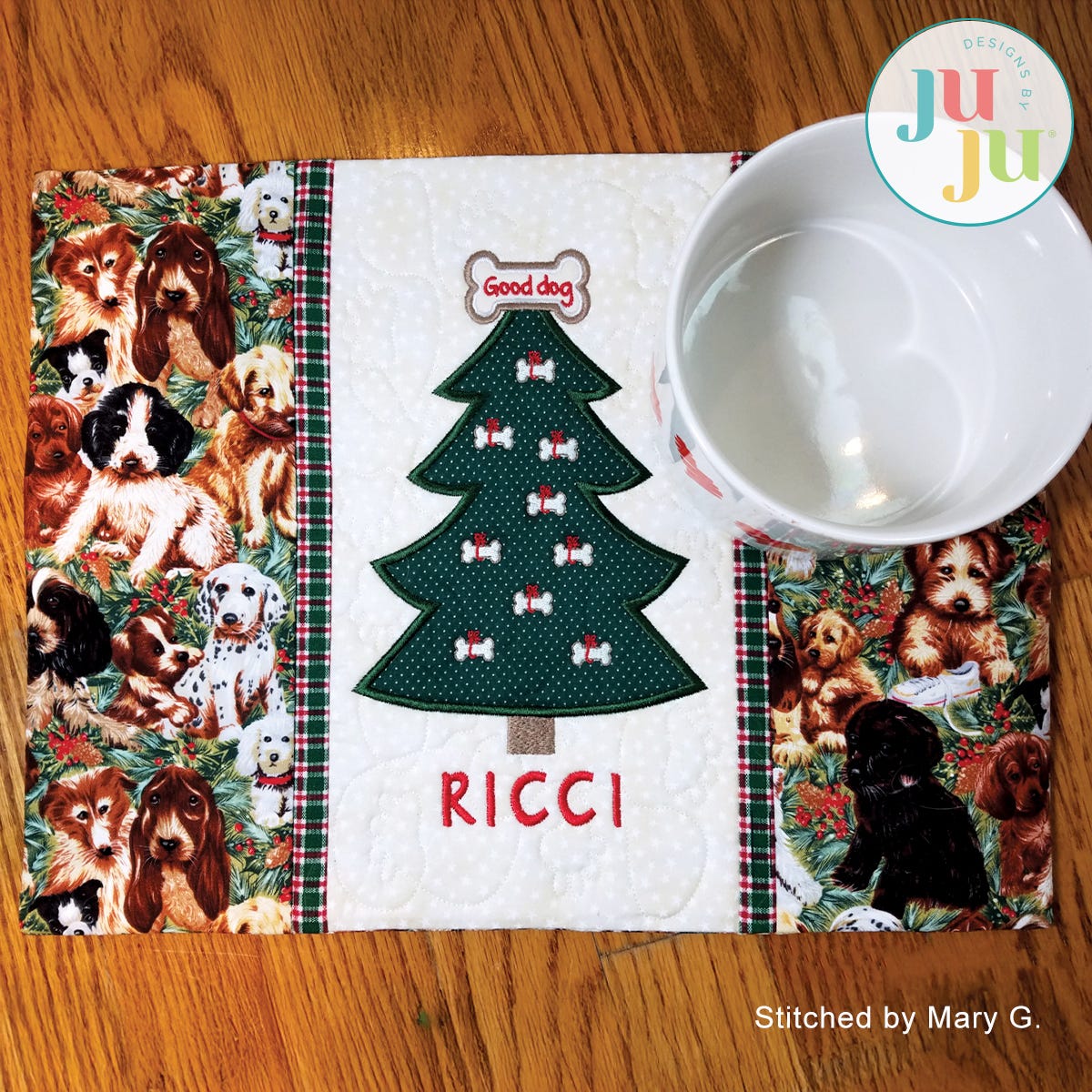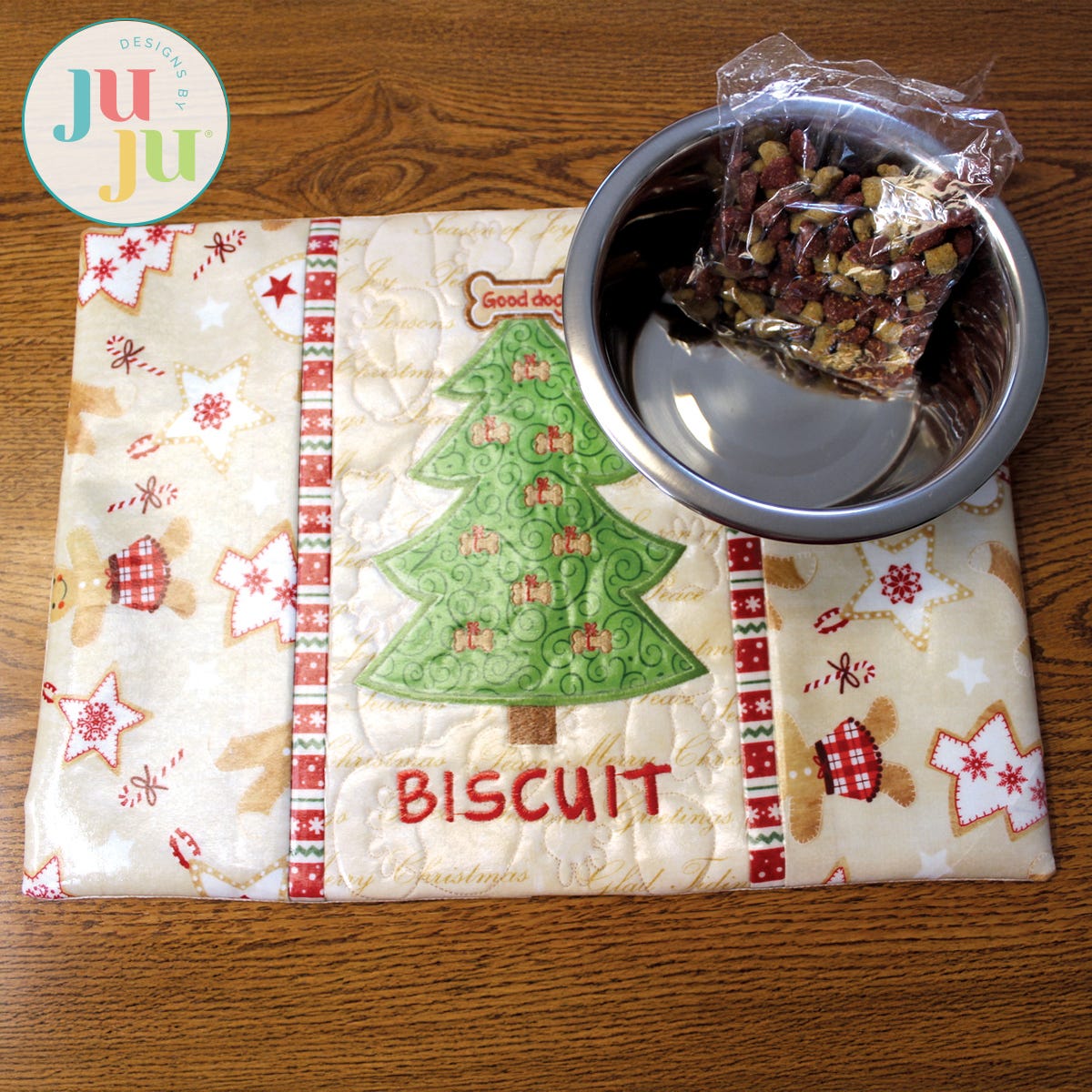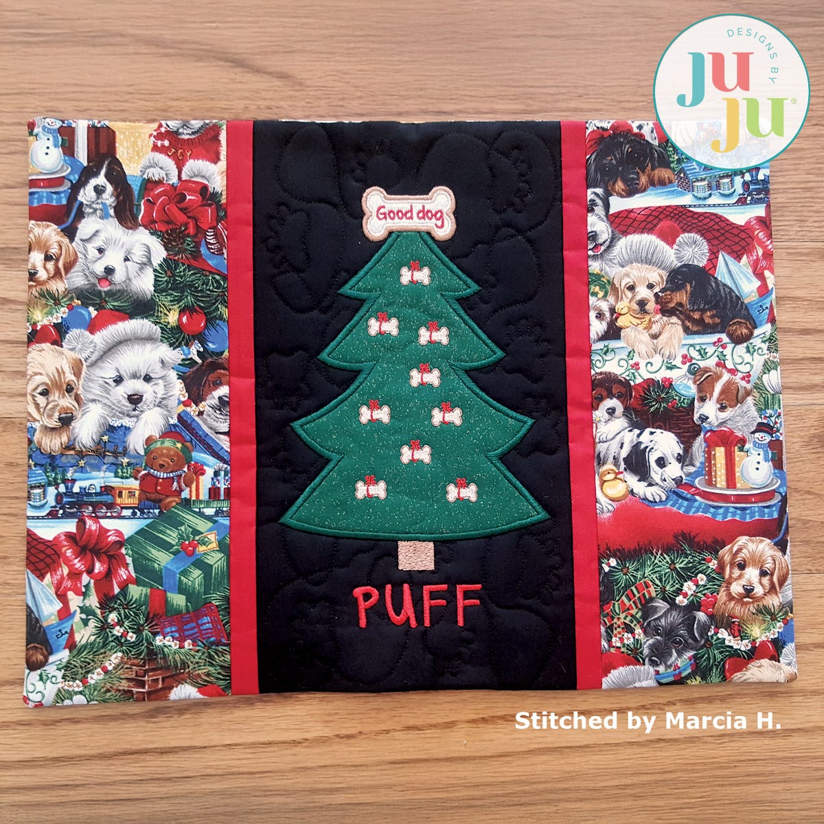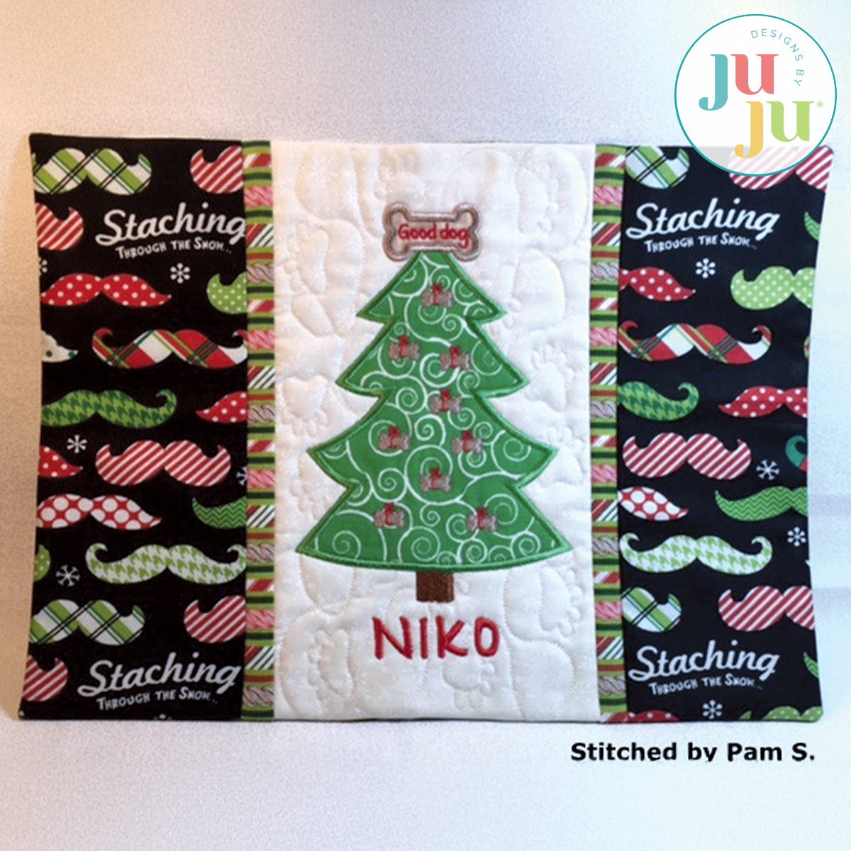 Want to make a dog feel special this holiday season? Why not make a mat just for him (or her)?! The mat is stitched in one hooping and backing is applied on the sewing machine. The tree and bone at the top of the tree are appliqued and the background behind the Christmas tree is motif quilted.