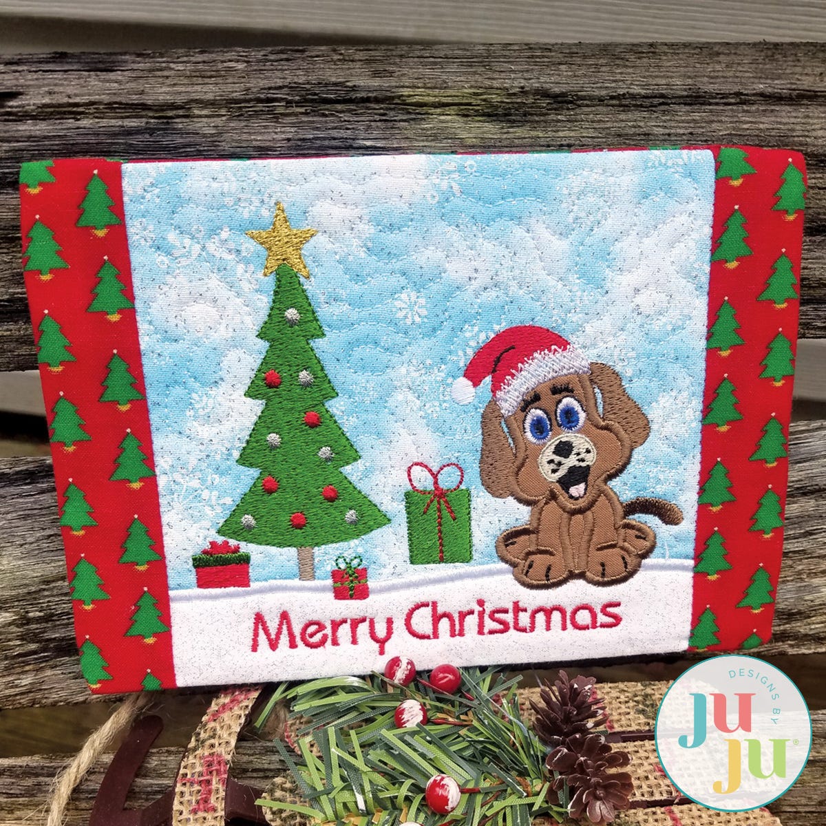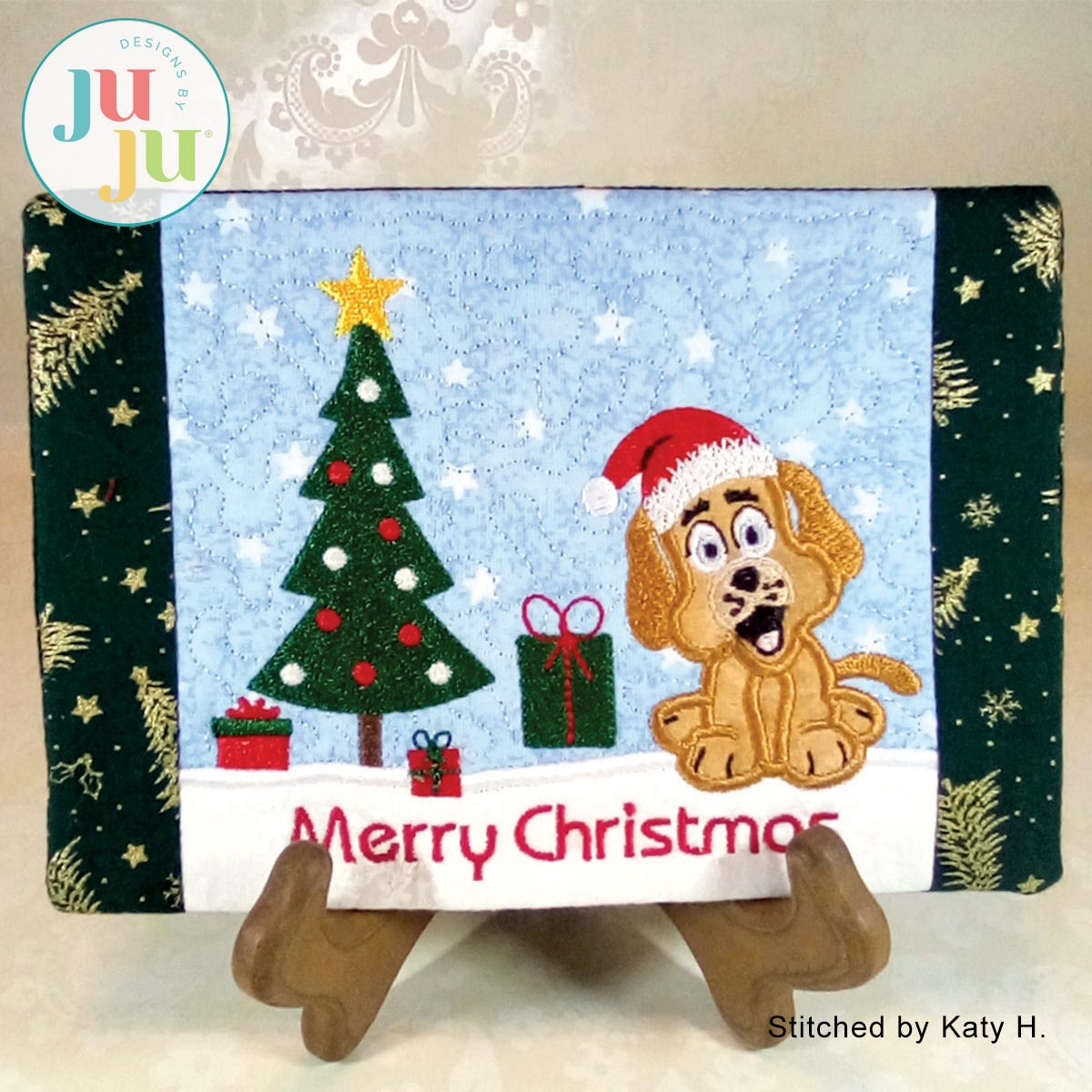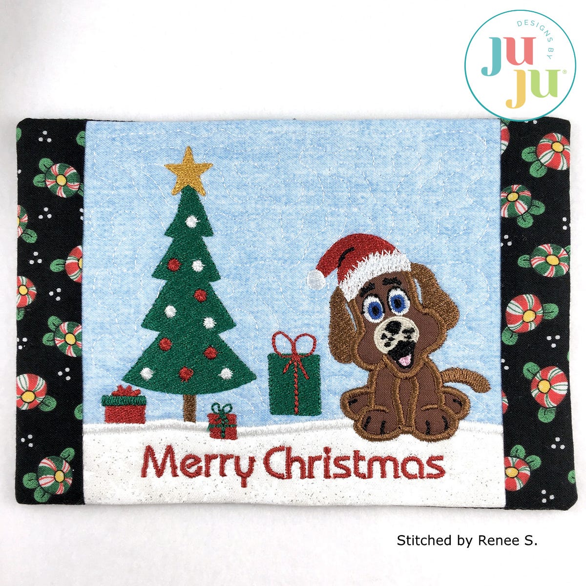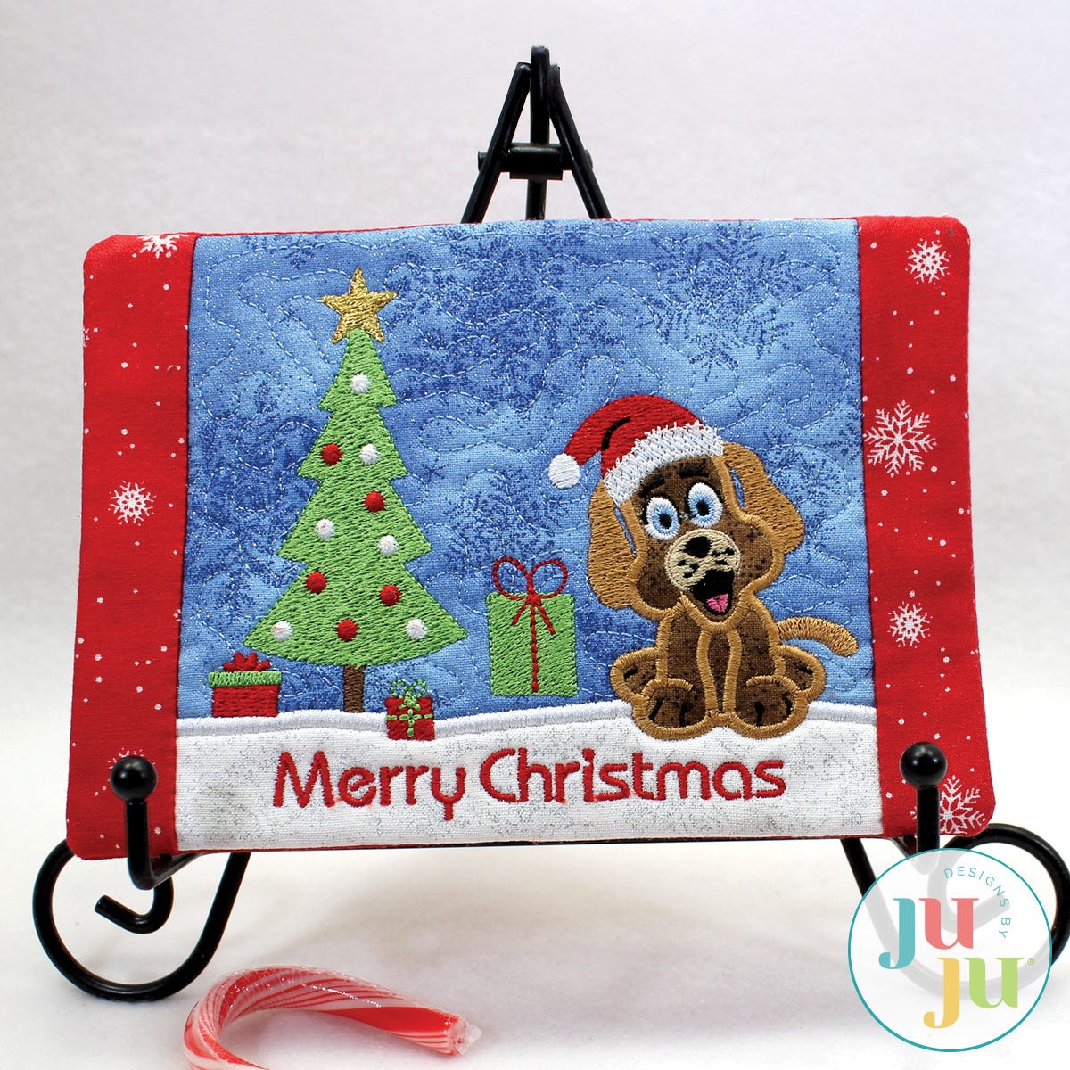 This mug rug is a great little gift for the dog lover in your life. And don't forget to make one for yourself, too! Send this mug rug as a Christmas card in an A7 envelope. Mug rugs are not just for a cup of cocoa, tea or coffee; they can also be displayed on a small easel to add a whimsical touch to your holiday decorating. The design is completely stitched as an in the hoop project. There is no other sewing machine or hand stitching required. The body of the dog is appliqued. It is easy to do. We will show you how with detailed instructions with photos.