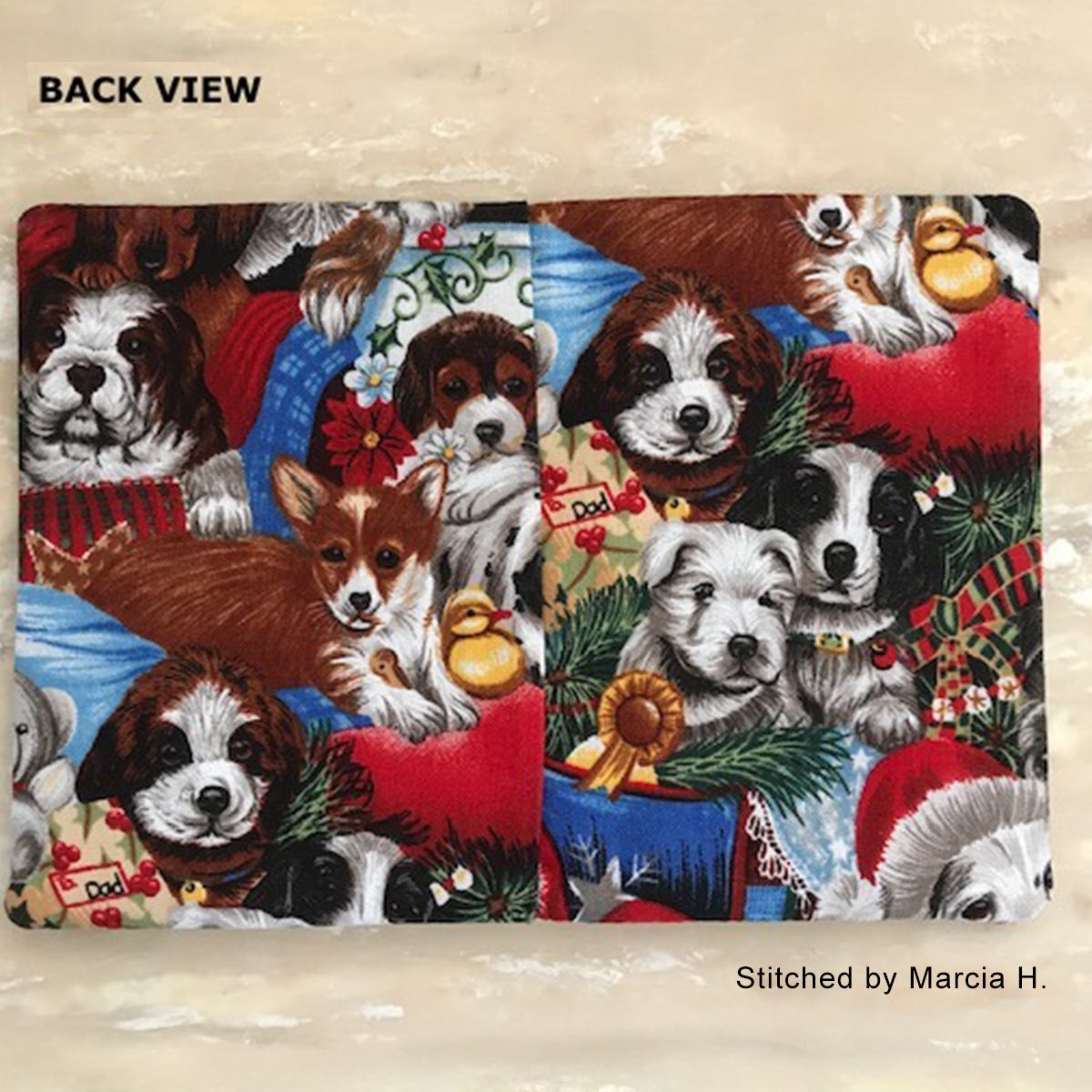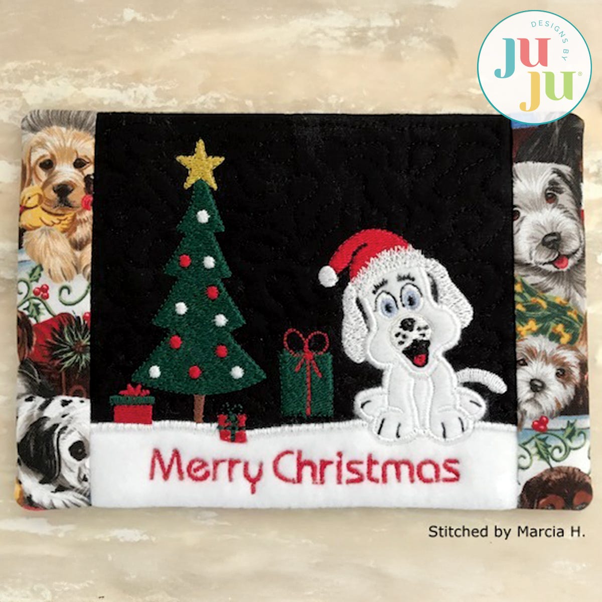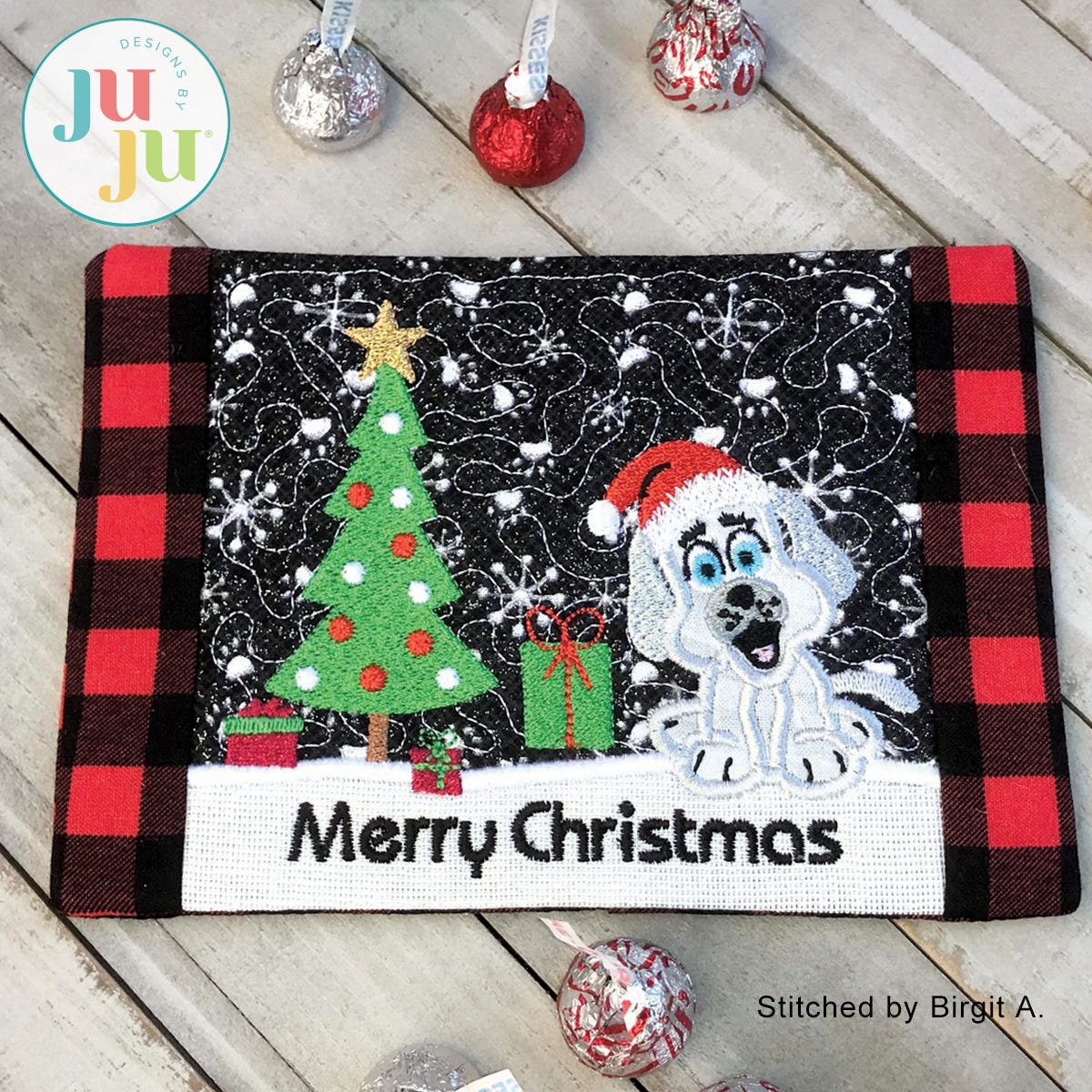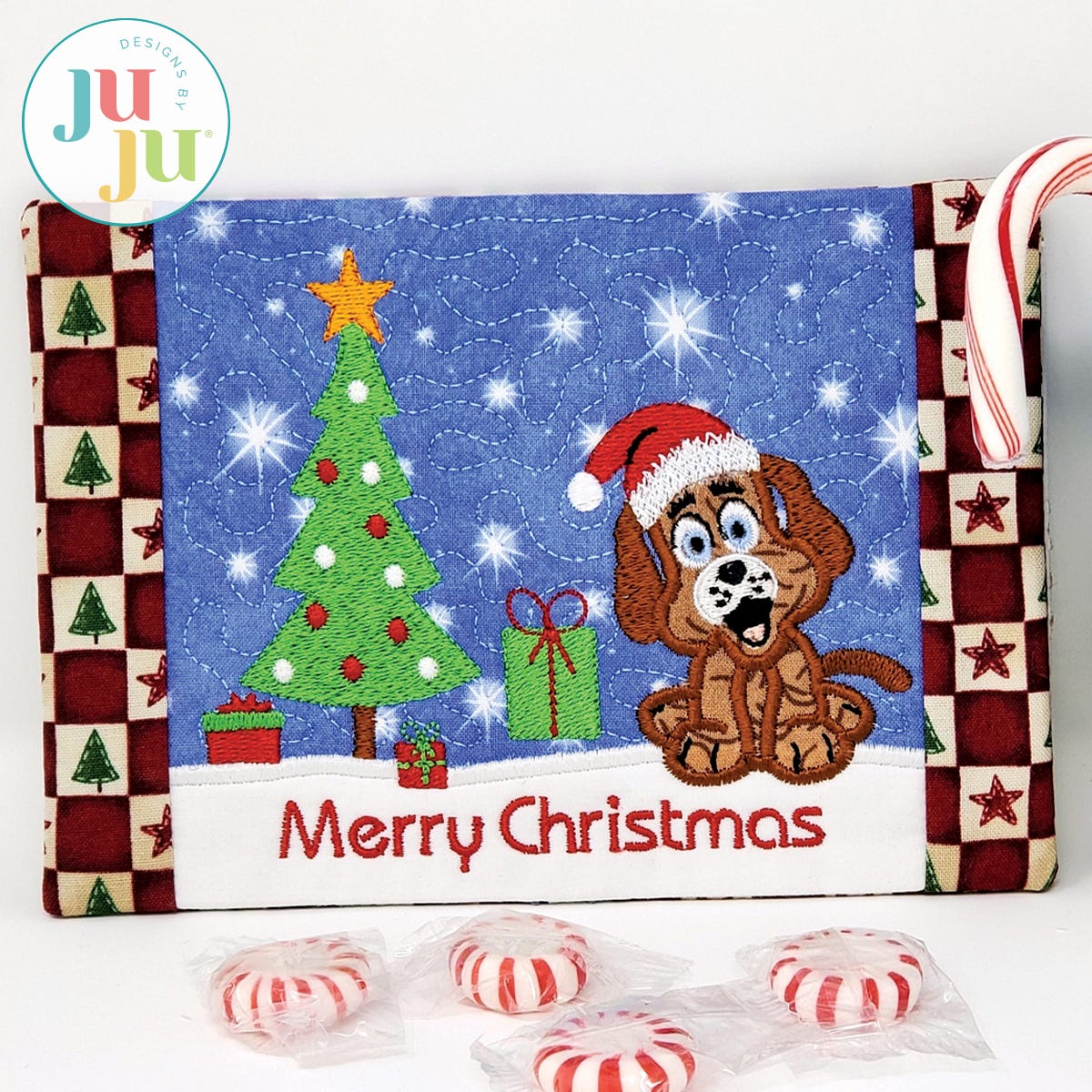 This mug rug is a great little gift for the dog lover in your life. And don't forget to make one for yourself, too! Send this mug rug as a Christmas card in an A7 envelope. Mug rugs are not just for a cup of cocoa, tea or coffee; they can also be displayed on a small easel to add a whimsical touch to your holiday decorating. The design is completely stitched as an in the hoop project. There is no other sewing machine or hand stitching required. The body of the dog is appliqued. It is easy to do. We will show you how with detailed instructions with photos.