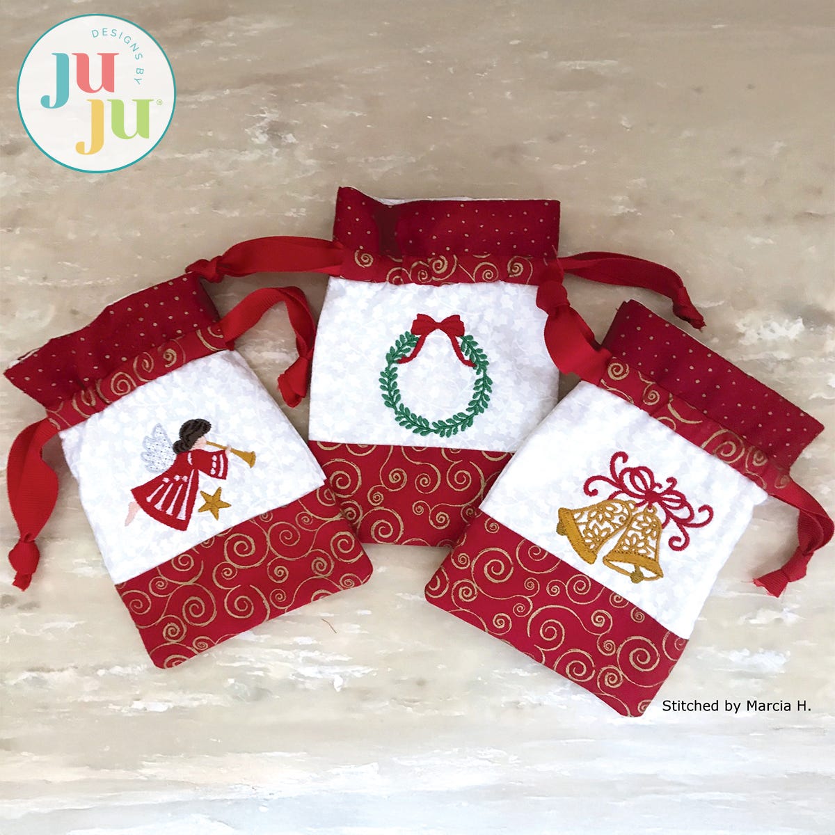 The bags are constructed as an in-the-hoop project, in two, easy hoopings. Only a small amount of machine stitching required if you wish to box the bottom of the bags. In that case, two, short, straight seams need to get stitched on the sewing machine. The bags are fully lined; no raw seams are visible.