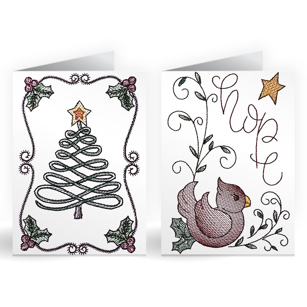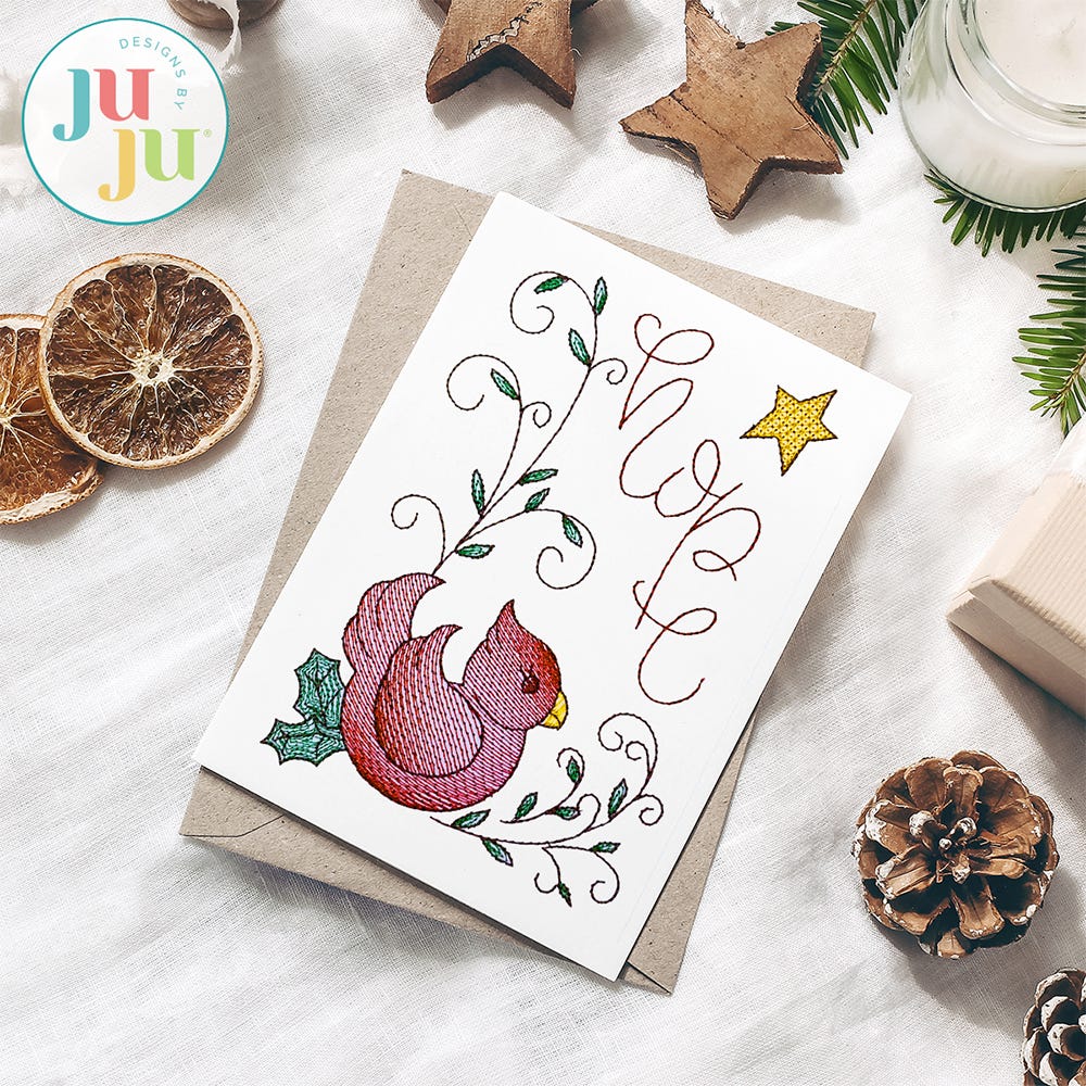 Introducing our Christmas Greeting Cards 25 embroidery set! This collection includes two lovely holiday greeting cards, one featuring a cardinal with the word HOPE, and one with a swirly Christmas tree surrounded by a frame with holly leaves. Perfect for adding a handmade touch to holiday messages and gifts.