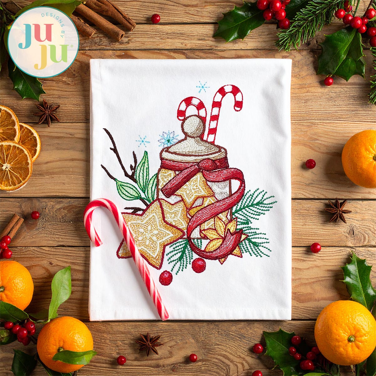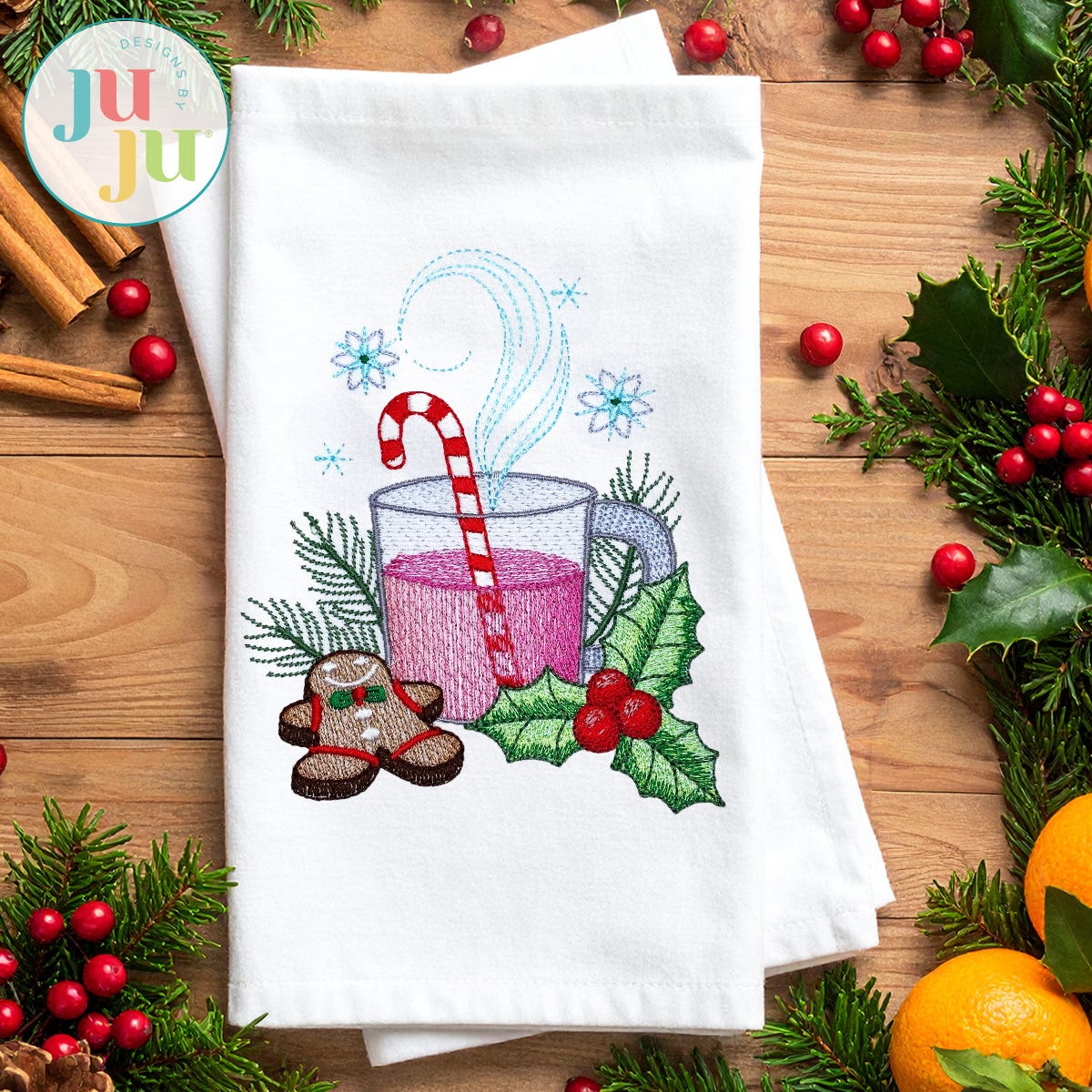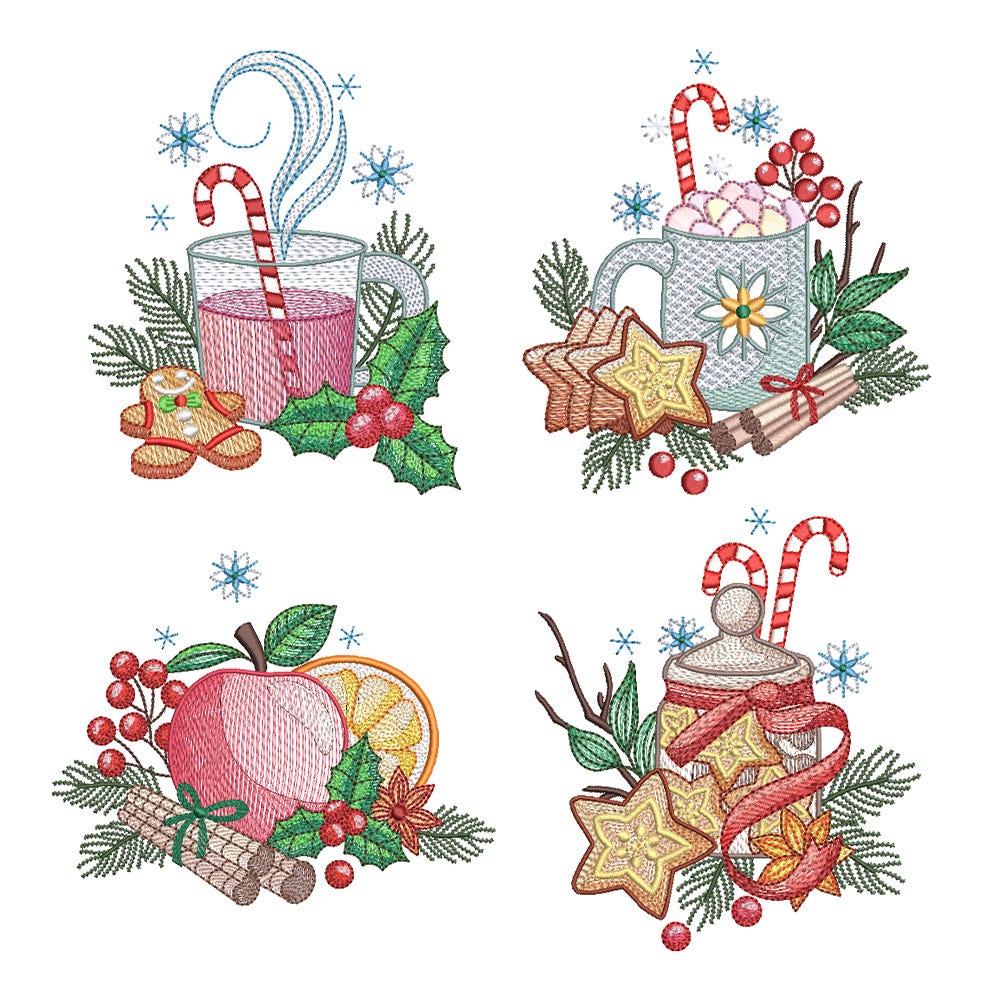 Add a sprinkle of holiday cheer to your stitching with our Christmas Kitchen Set 1! This set includes 4 festive embroidery-only designs, each featuring cozy kitchen scenes like cocoa, cookies, candy canes, and seasonal fruits. Perfect for towels, table linens, and more holiday decor. These designs feature a variety of embroidery stitch types including motif stitches, bean stitch outlines, and multiple color layers of lighter density fill to create a blended, variegated, textured look.