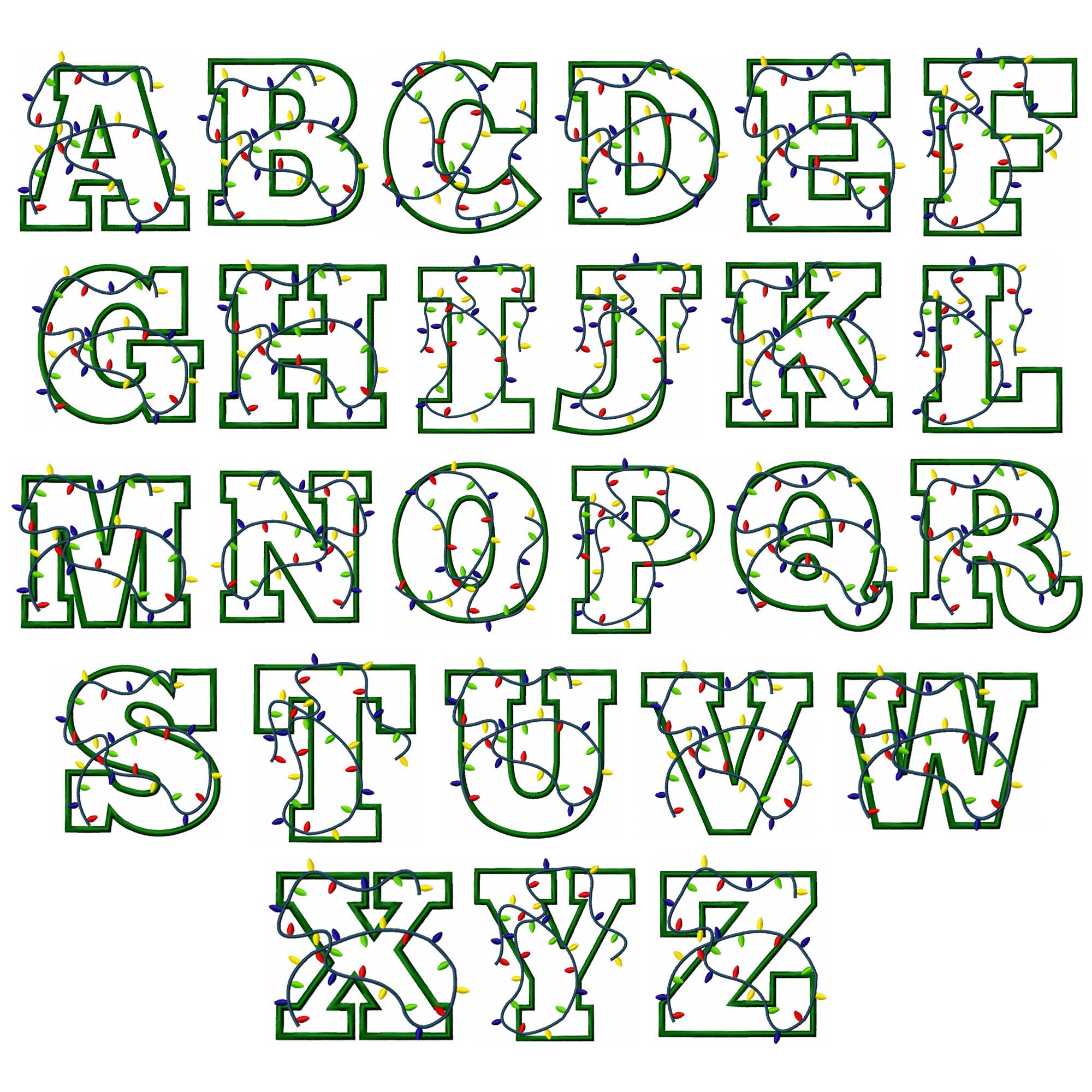 Customize holiday projects with our Christmas Lights applique alphabet! Capital Letters A-Z included.