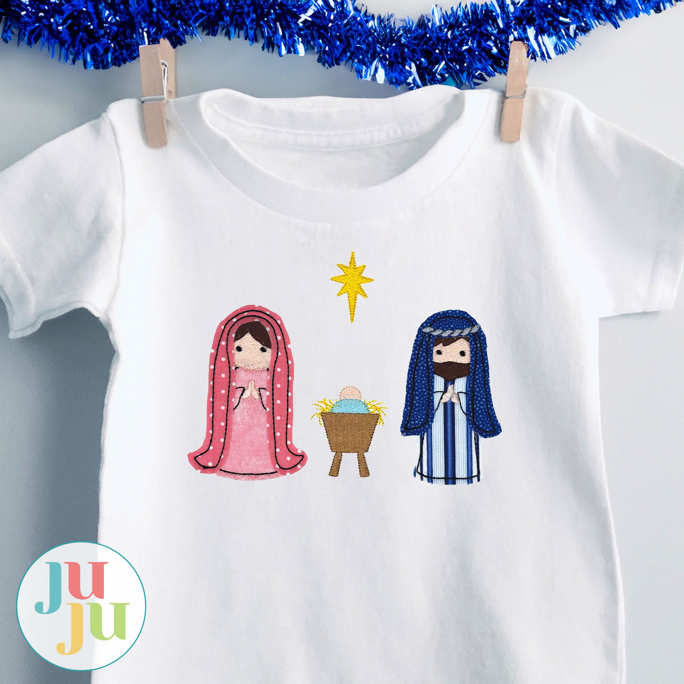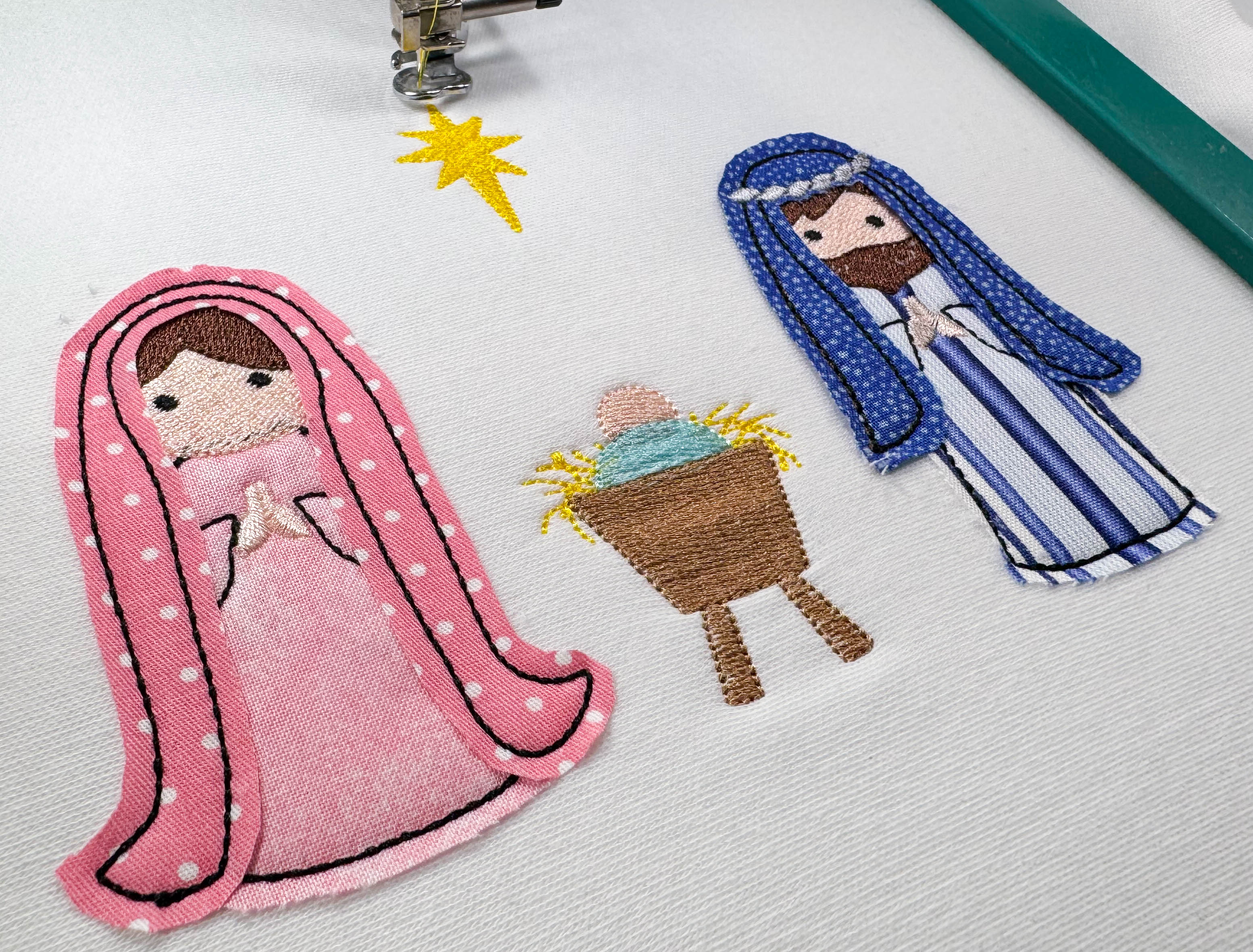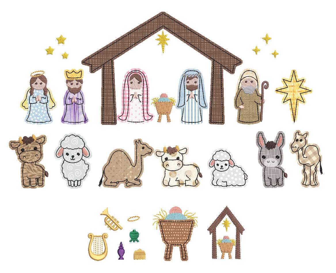 Nativity Kit includes 15 appliques (angel, camel, cow, donkey, Joseph, king, lamb, laying camel, laying cow, laying lamb, manger, Mary, north star, shepherd, stable) and 14 embroidery-only accents (assorted stars, gold, frankincense, myrrh, harp, trumpet, halo, mini manger, mini stable scene).