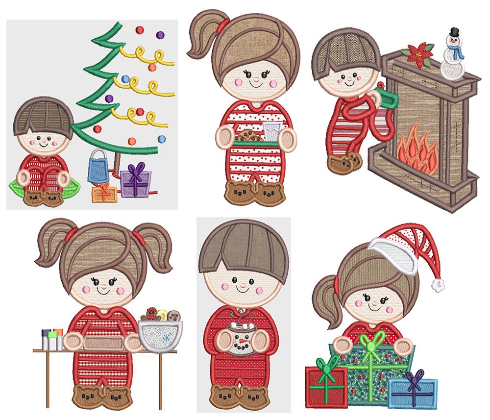 6 precious Christmas pajama kids in applique!