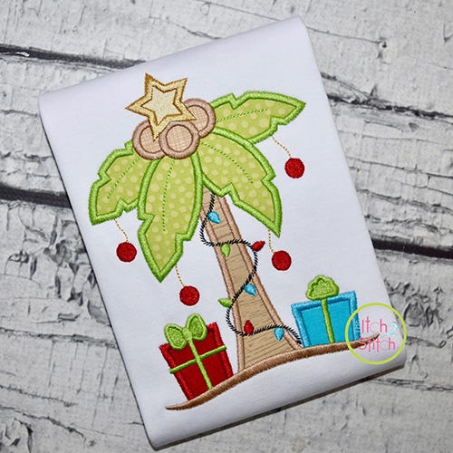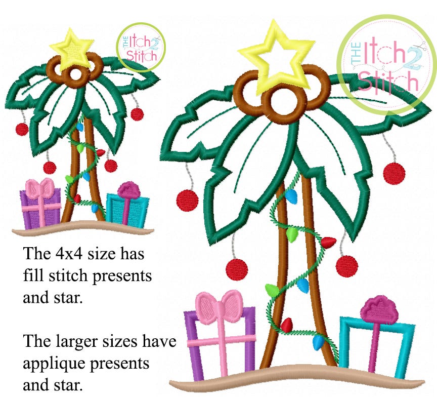 Five sizes are included in the file. Please note the 4x4 size has fill stitch presents and star (as pictured above).