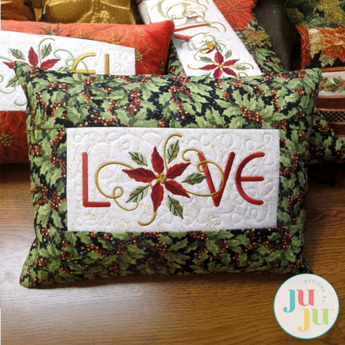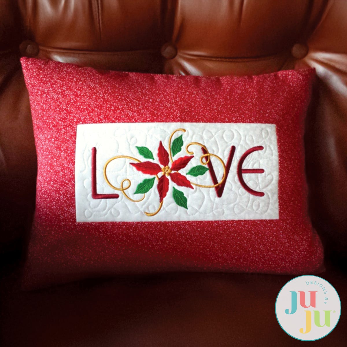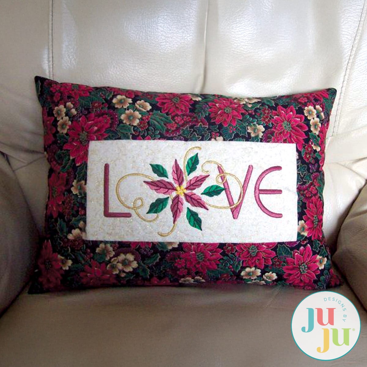 This Christmas Pillow-Love design will allow you to make a 12" x 16" pillow almost completely done in the hoop. The pillow's center background is meander quilted and the sides are pieced onto the center, all done in the hoop. The pillow's back has a Velcro closure, also stitched while in the hoop. The side seams are sewn on the sewing machine. Thorough instructions with many photos will guide you through the process. A fun way to add a festive touch to your home decor. Makes a great gift as well. Also included is the pillow front without design for you to drop in any design of your choosing.