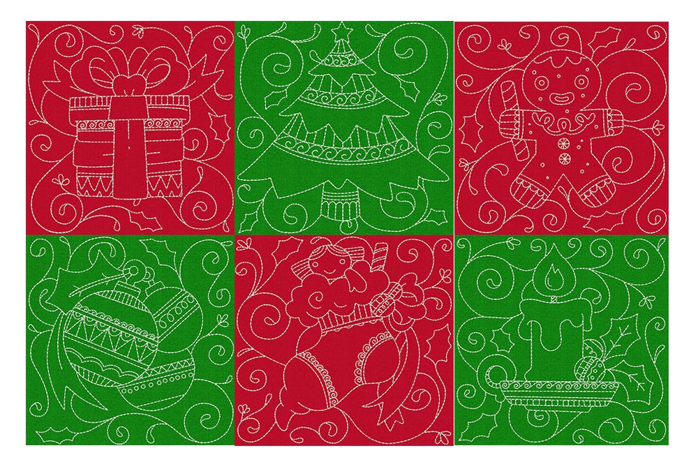 6 Beautiful Christmas themed quilt blocks in single and triple stitch