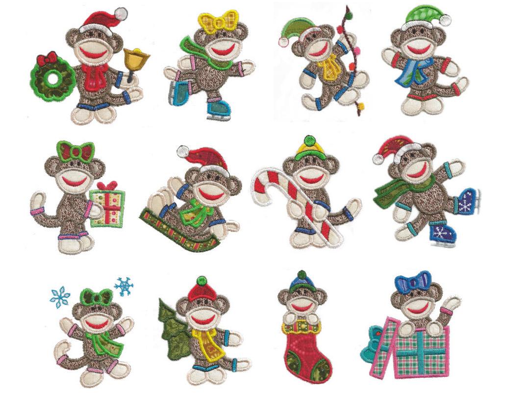 Due to popular demand, we have decided to make our applique sock monkeys available for the 4x4 hoop. This is our first set in this size and there will be more to come! We promised a Christmas sock monkeys set, and we are pleased to bring you these 12 adorable Christmas themed designs.Ā Sock monkey material: Erin Michaels for Moda (we got ours from www.fatquartershop.com)