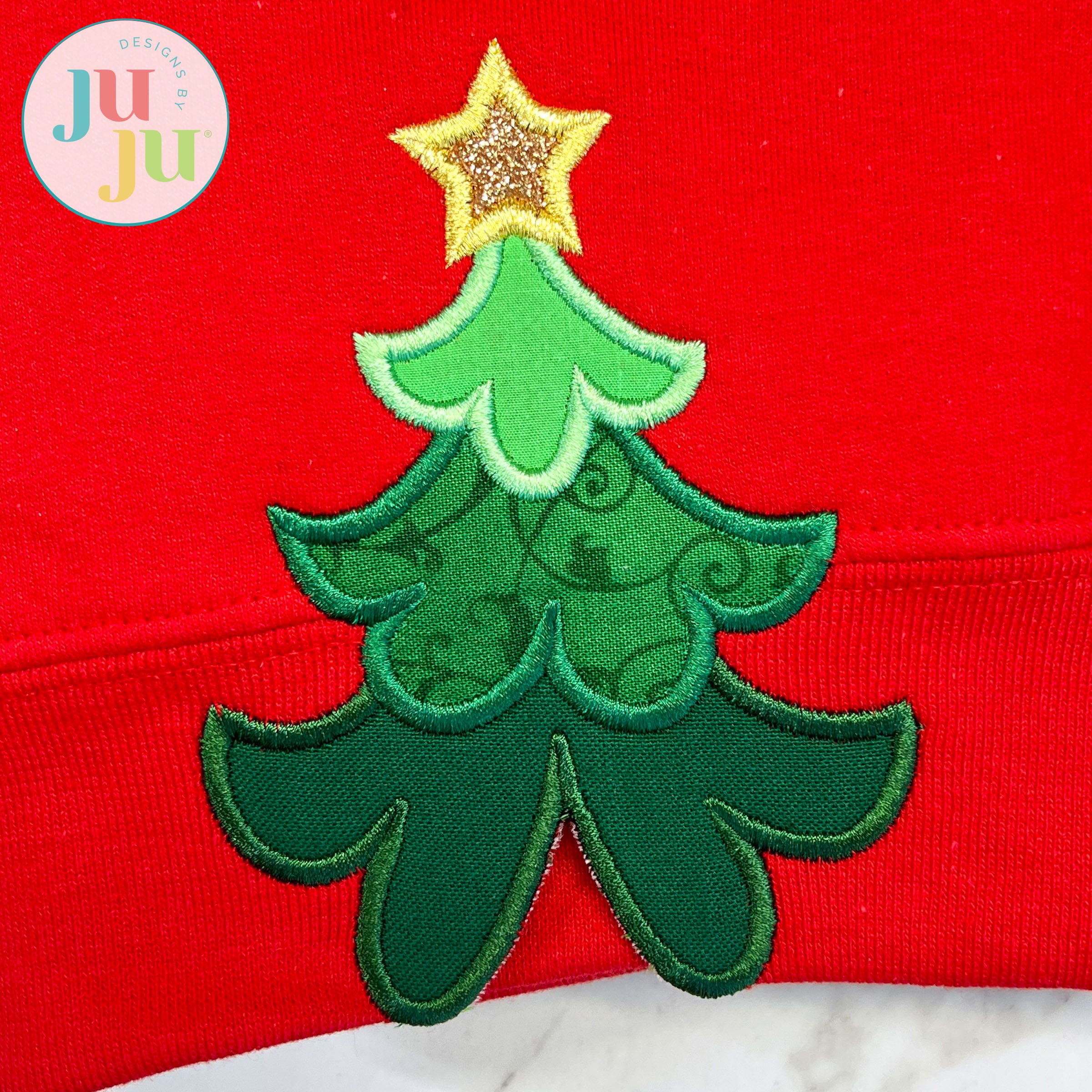 If you like the trendy side seam bow applique craze, you are going to love this Christmas Tree design! Perfect for holiday tees, sweatshirts and more!