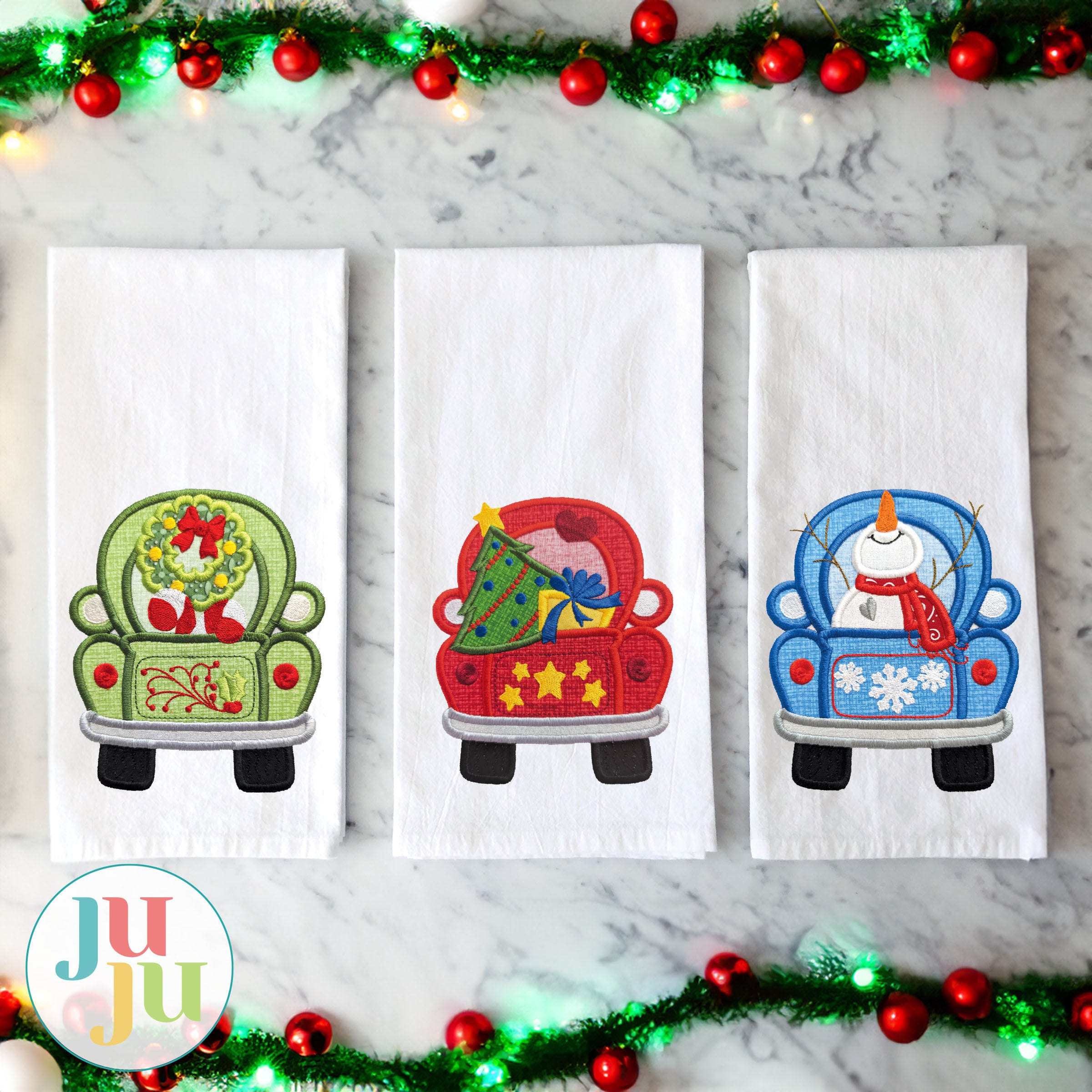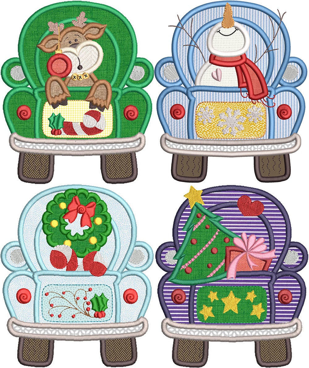 Everything you need for Christmas is out for delivery! These four satin stitch applique trucks are loaded for the holidays with a reindeer, snowman, wreath, tree and more! Four sizes included (4x4, 5x7, 6x10 and 8x8).