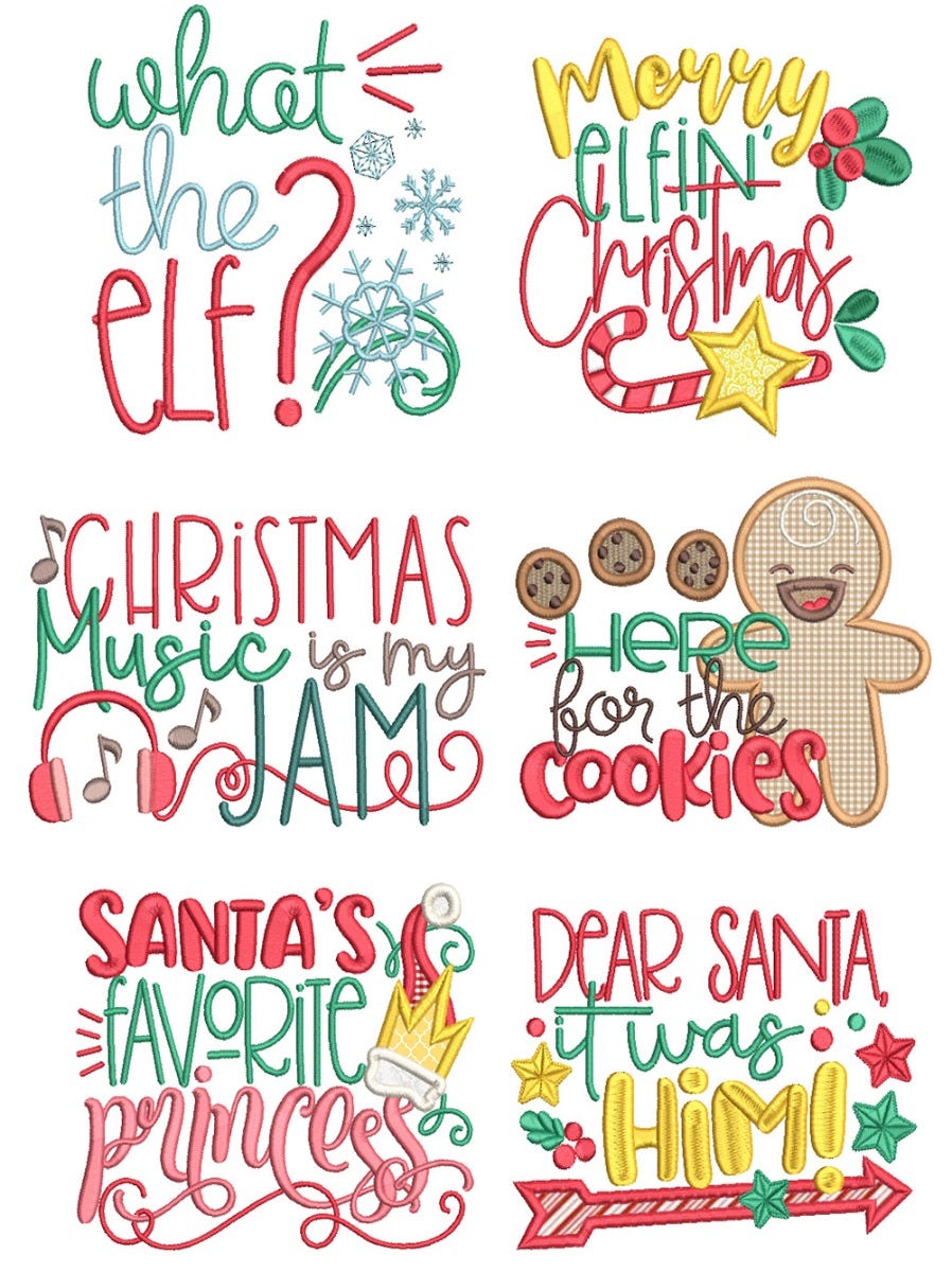 *Please note that the following designs contain applique components:Ā Merry Elfin' Christmas / Here for the cookies / Santa's favorite princess / Dear Santa, it was him!Ā