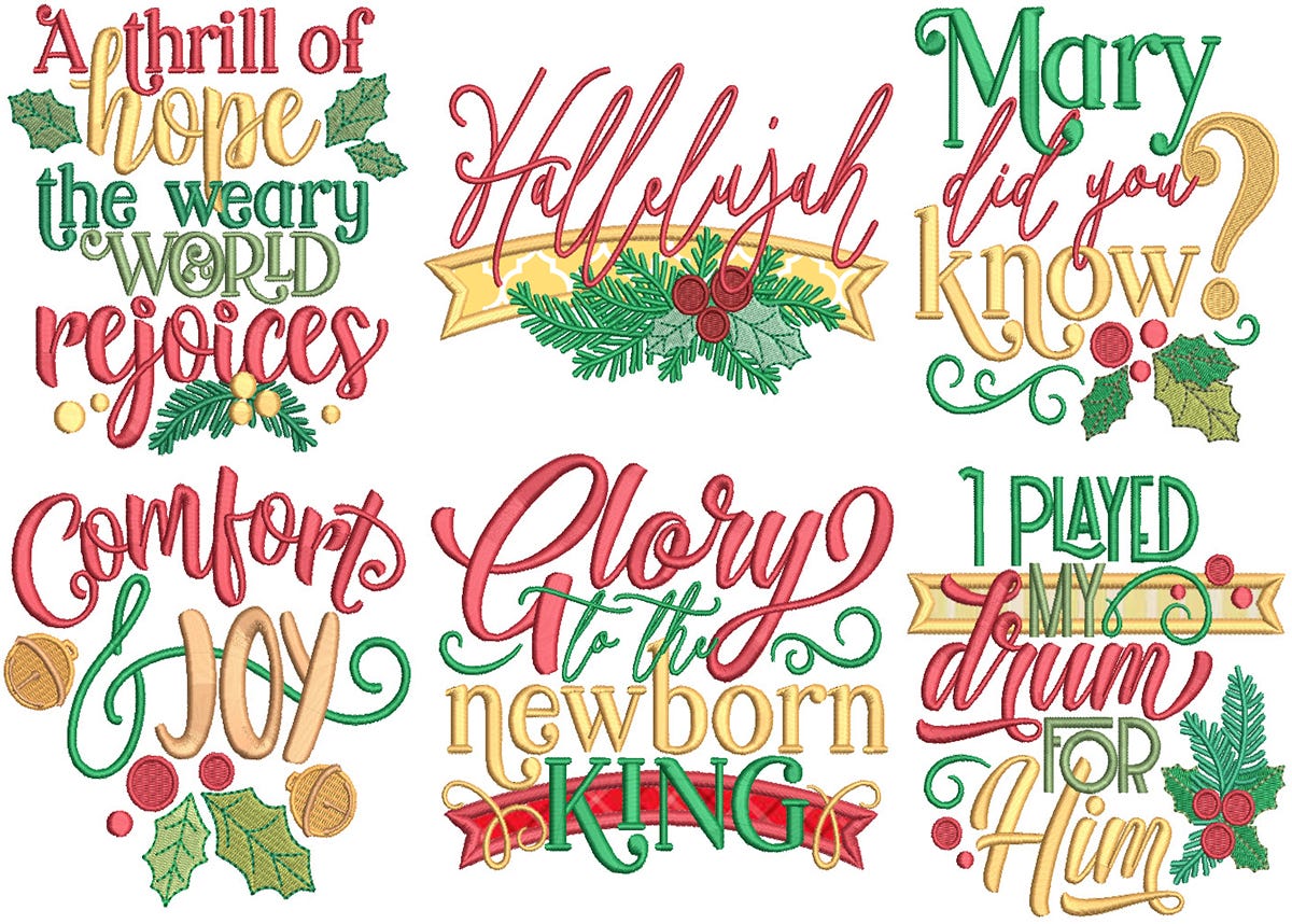 *Please note that the following designs contain applique components:Ā Hallelujah / Glory to the newborn king / I played my drum for him /Ā