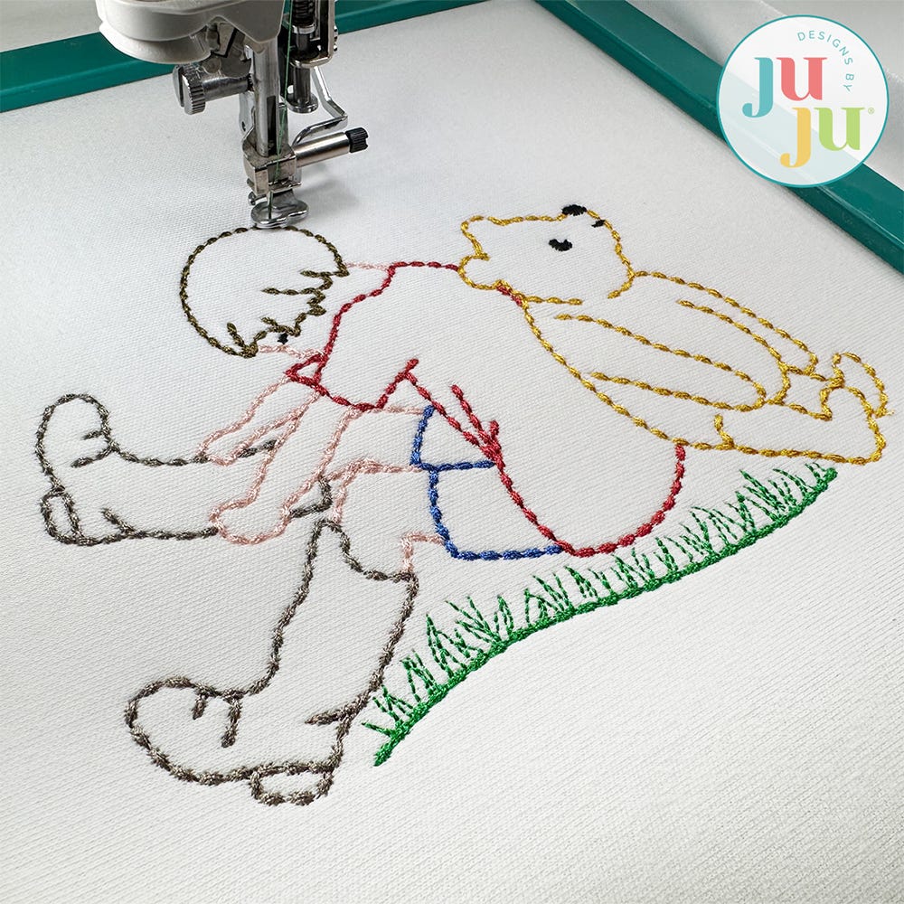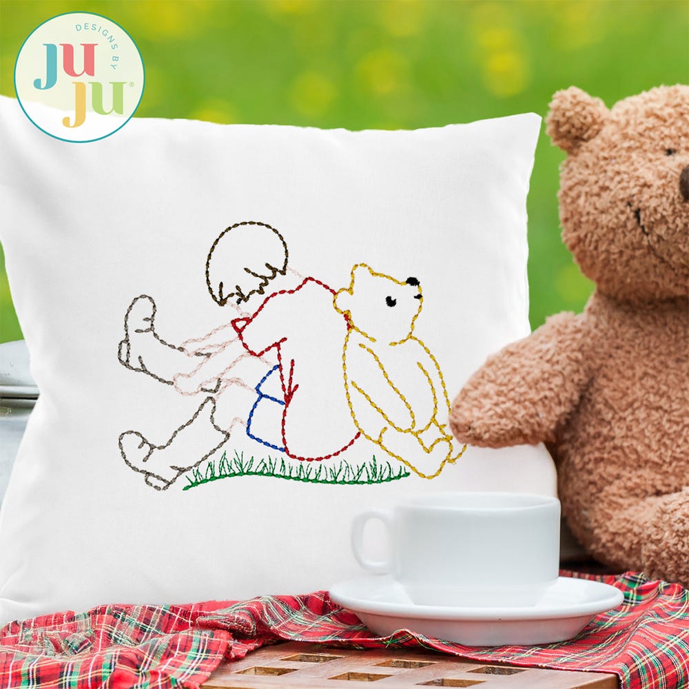 Winnie-the-Pooh and his best friend Christopher Robin make the perfect pair! This single embroidery-only design features a heavy bean stitch (seed stitch) for a hand-stitched look.