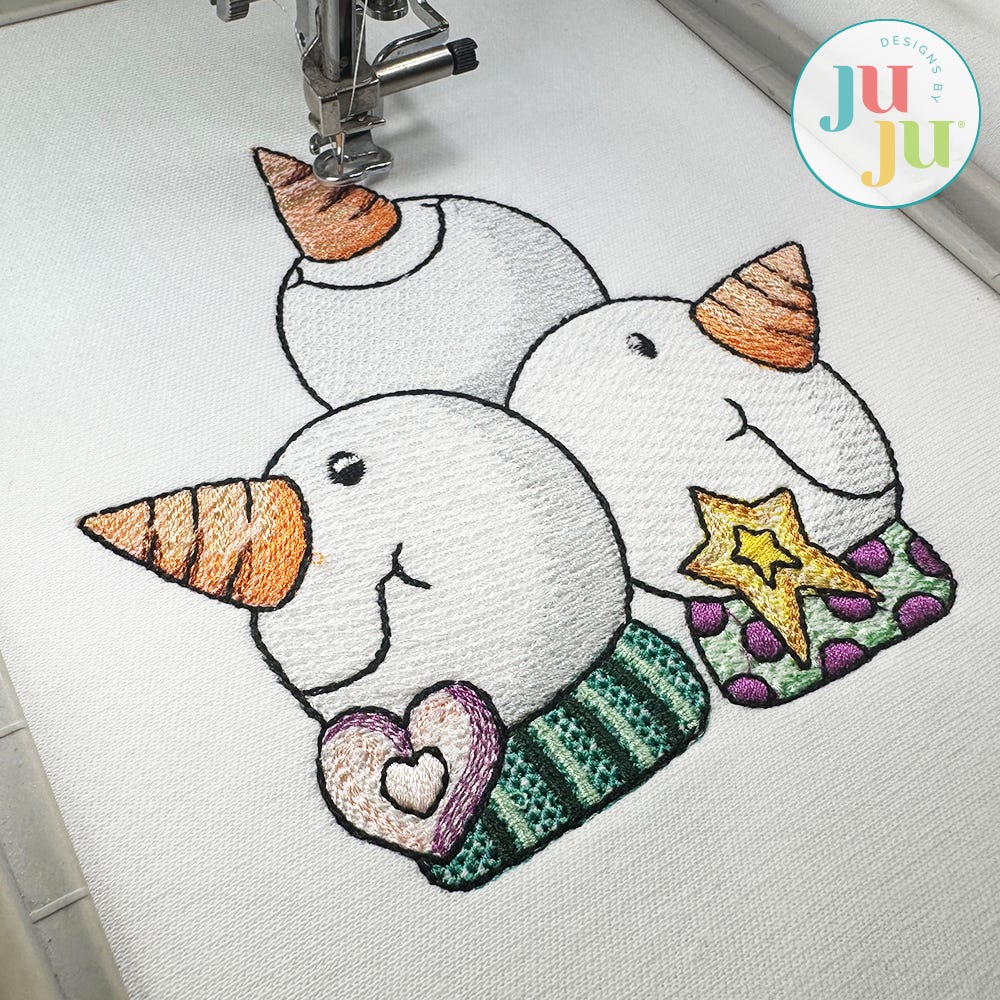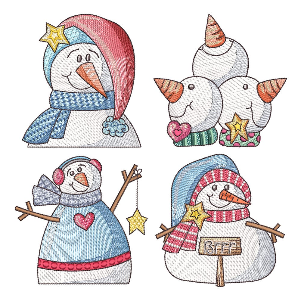 This collection includes four festive embroidery-only snowmen designs featuring playful seasonal artwork in a fun chunky round style.