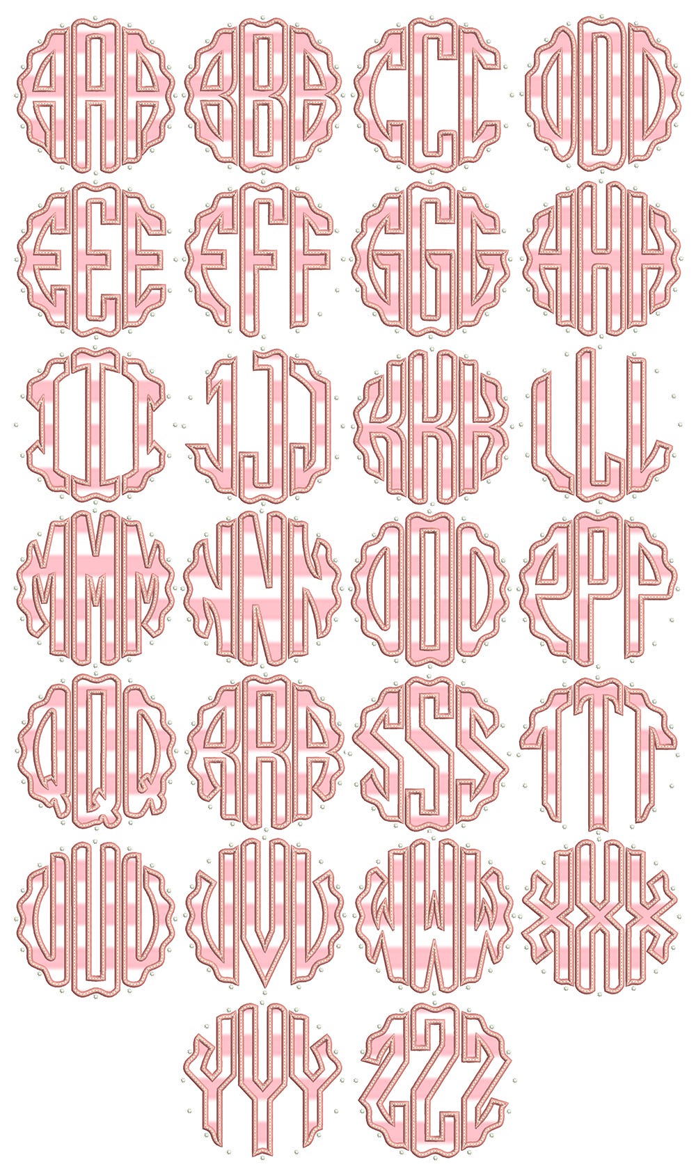 A beautiful and dainty three letter circular scalloped applique monogram in 5 sizes!!