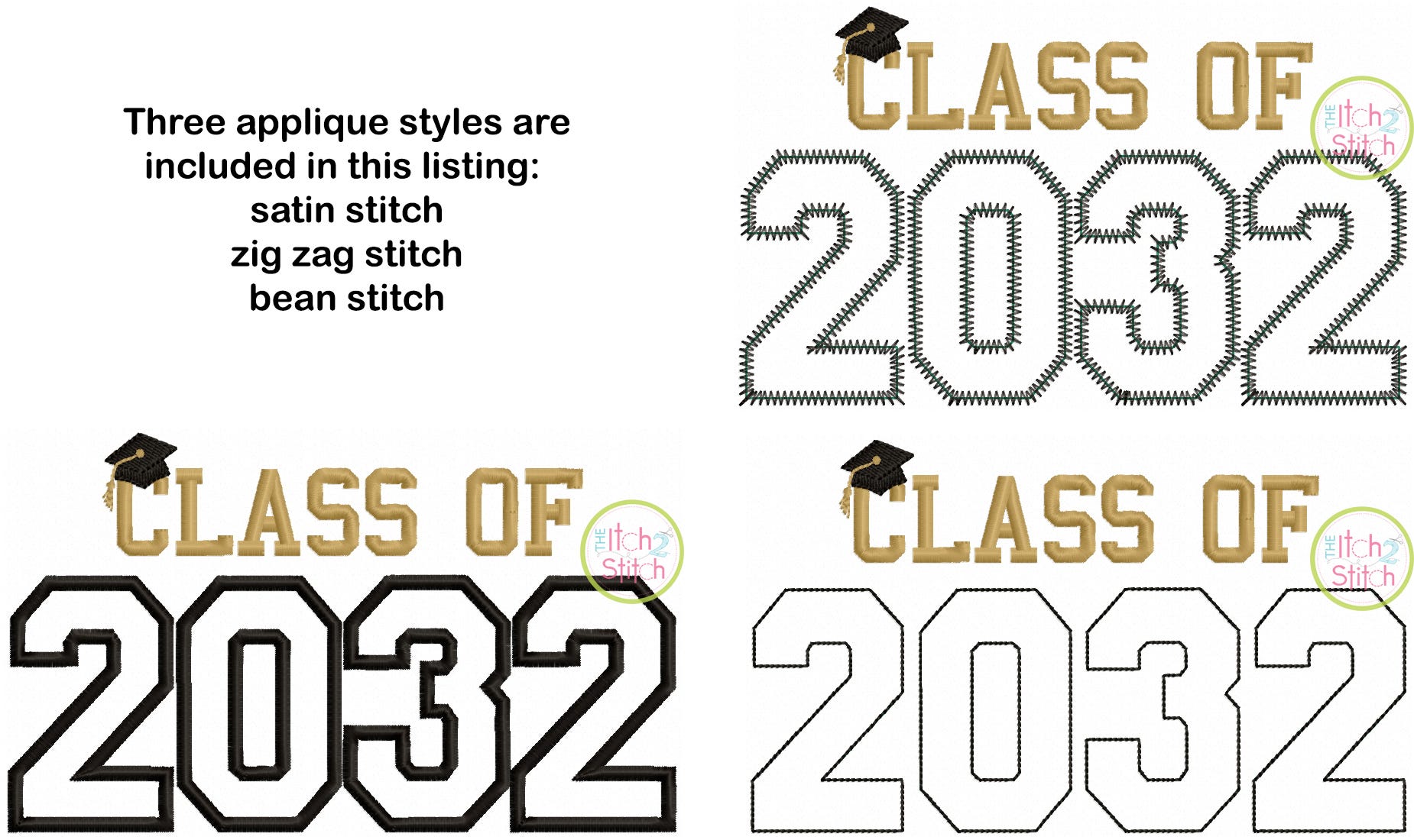 Three versions are included with purchase: satin stitch applique, zig zag applique and bean stitch applique. Please note a 4x4 size is NOT included.