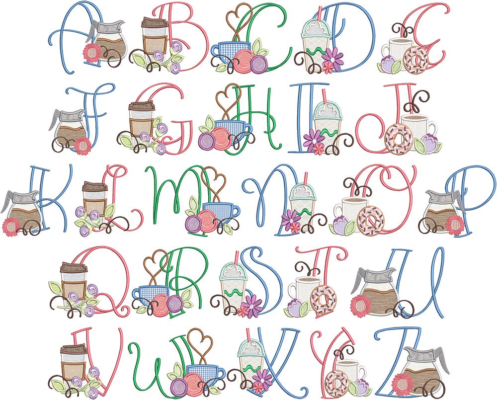 Coffee pots, mugs and to-go cups take center stage in our Coffee Lovers Applique Alphabet! The satin stitch letters are decorated with coffee-themed applique designs. There is one file per letter, as pictured.